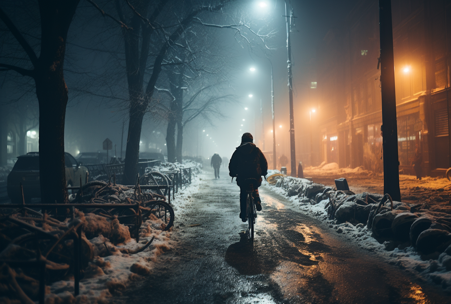 Cyclist rides through a foggy, snow-covered street at night, illuminated by warm streetlights.