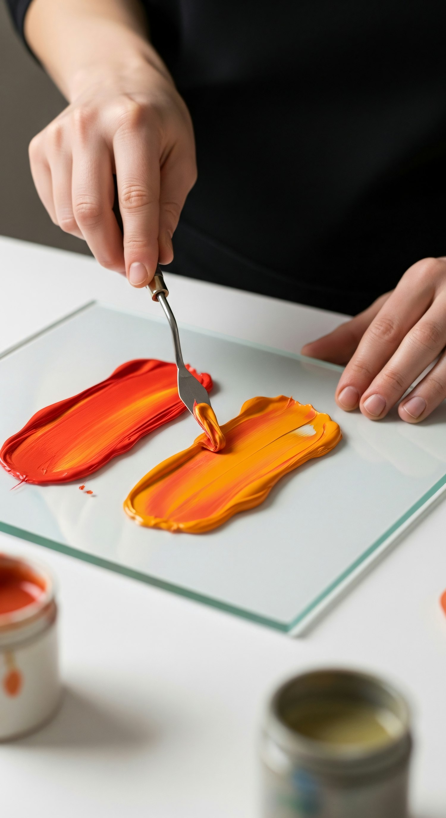 Close-up of a hand mixing vibrant orange and red paint on a glass palette with a knife, showcasing artistic creativity and vivid colors.