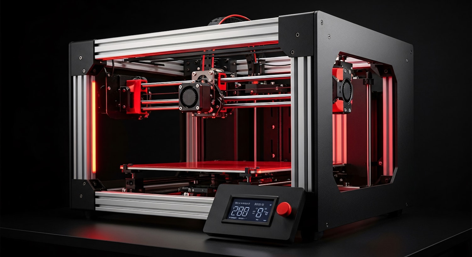 Sleek 3D printer with red LED lighting, aluminum frame, and a digital control panel, perfect for precision printing projects.