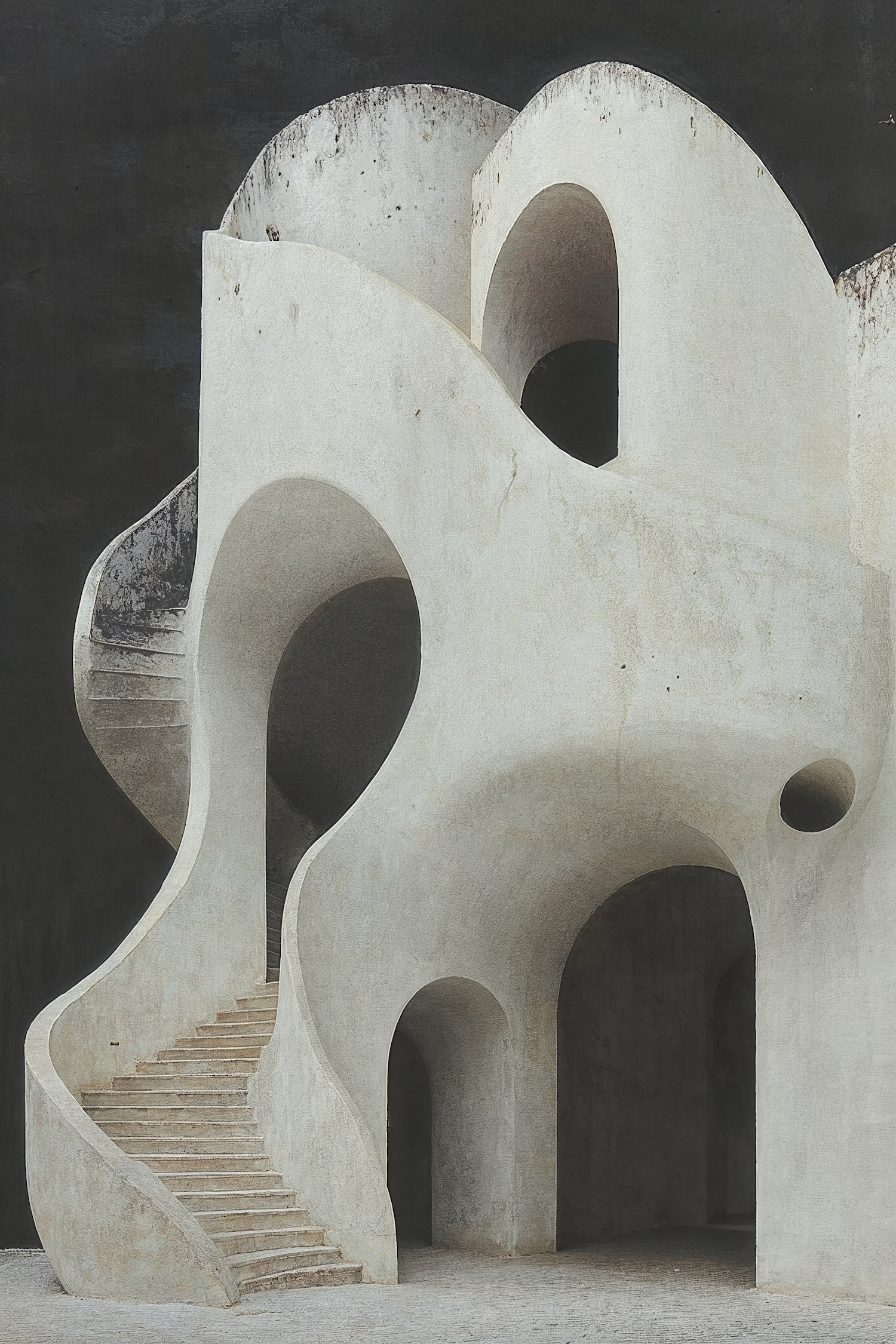 Modern architectural structure with flowing curves, arches, and a spiral staircase, set against a dark background for dramatic contrast.