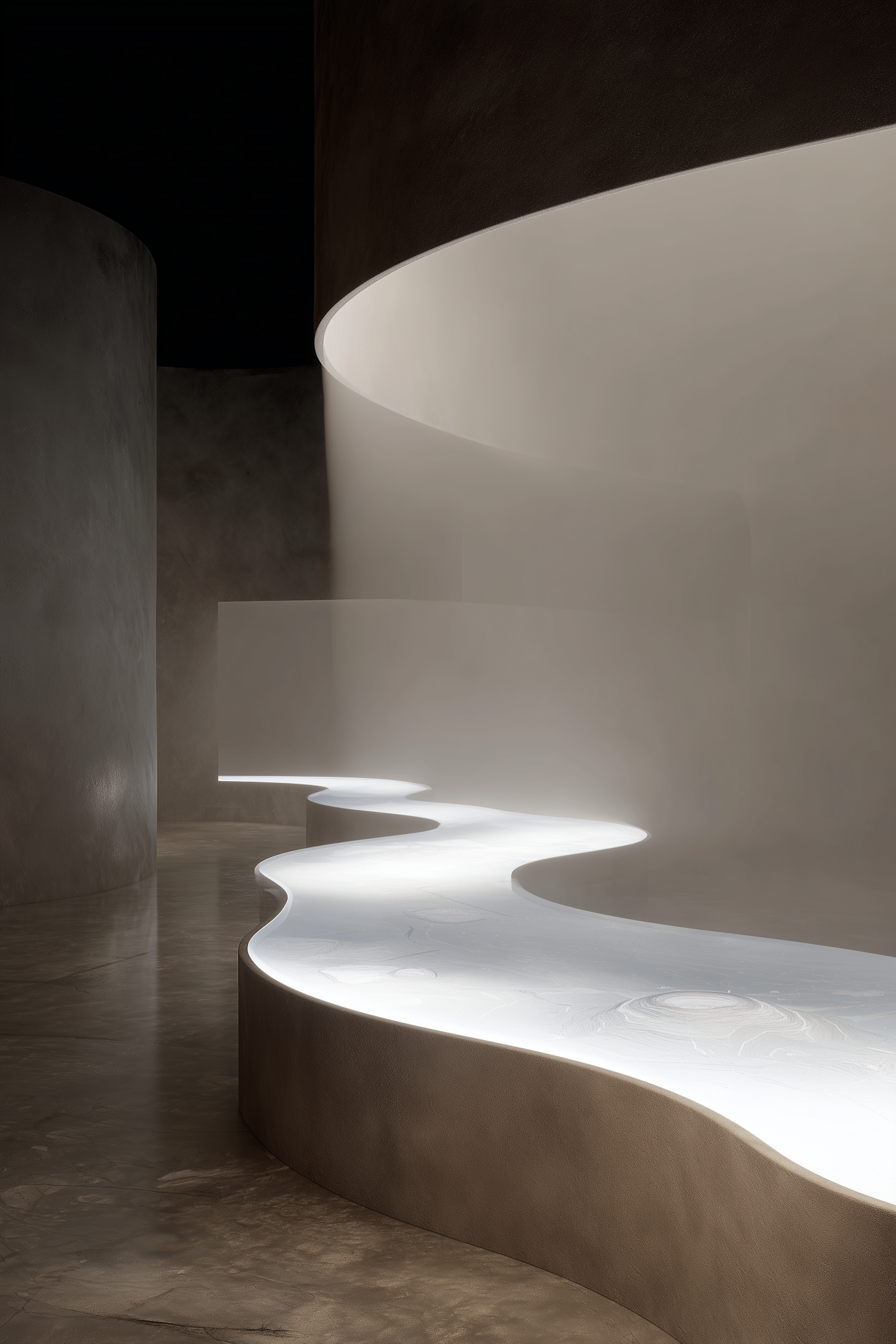 A sleek, modern interior with a glowing, curving pathway and minimalist textured walls, creating a serene and futuristic ambiance.