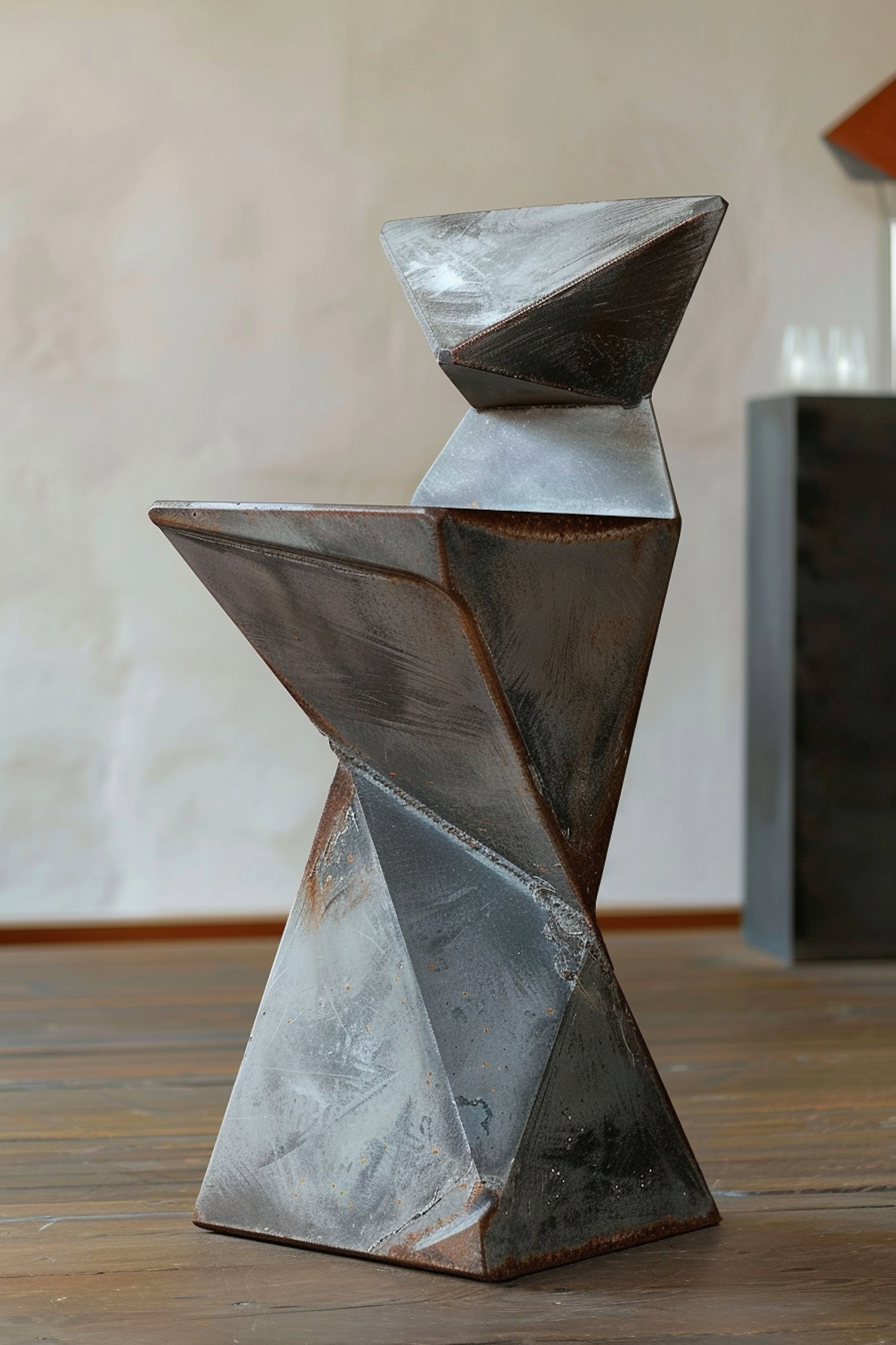 Abstract metal sculpture with geometric shapes and weathered texture, set against a neutral background on a wooden floor.