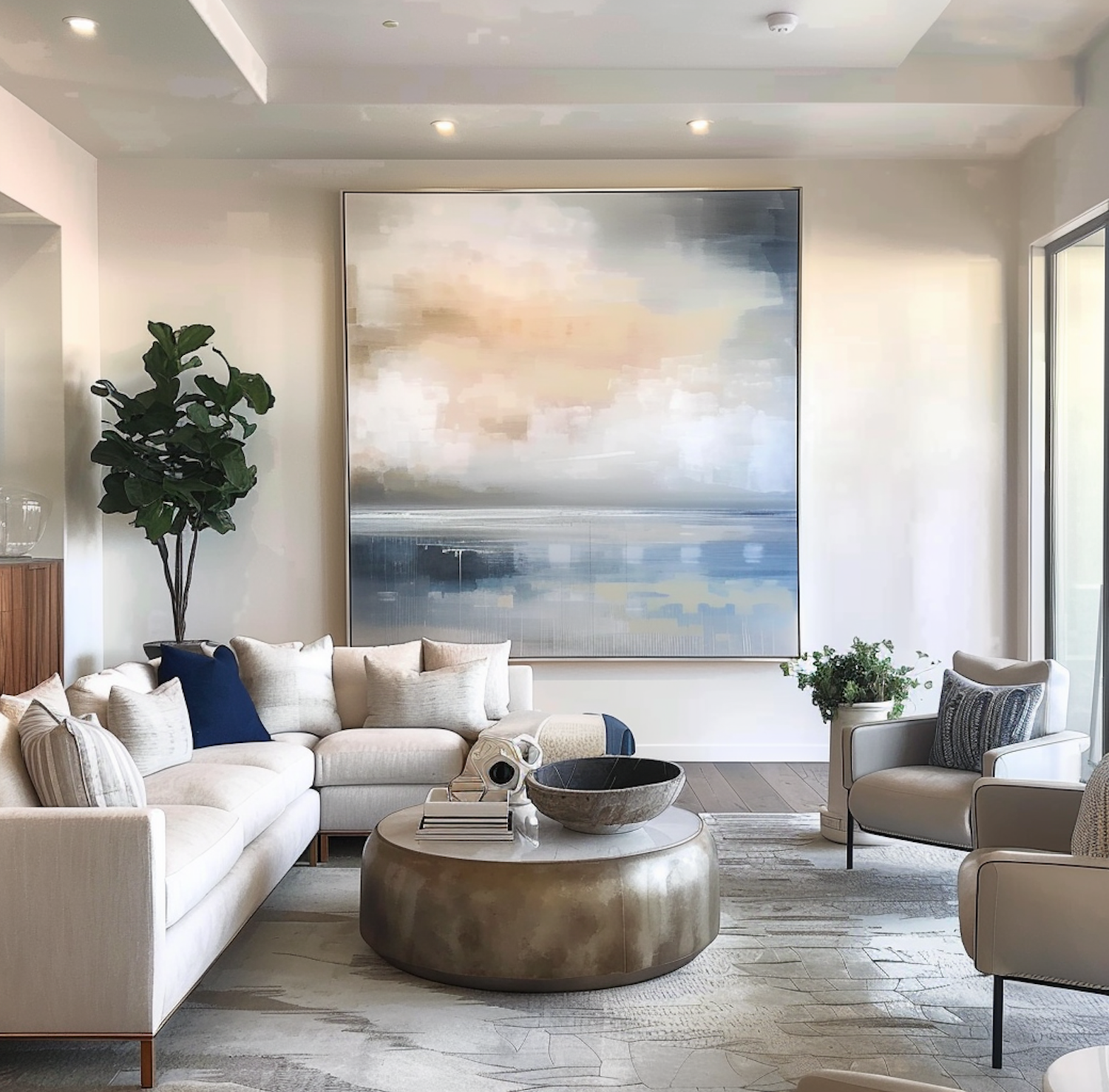 Modern living room with abstract art, plush sofa, metallic coffee table, and natural light. Neutral tones create a calming atmosphere.
