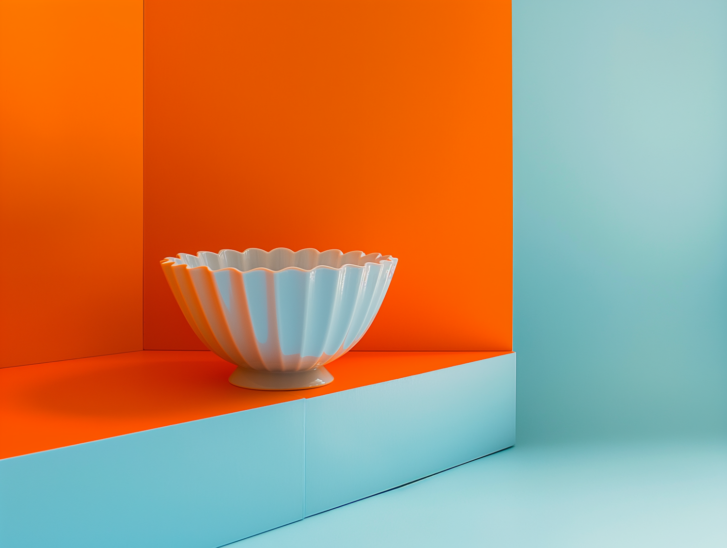 Elegant white ceramic bowl on vibrant orange and teal background, showcasing modern minimalistic design with striking color contrast.