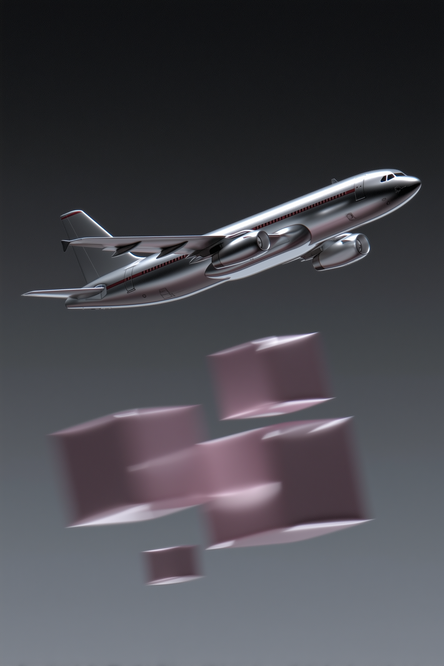 A sleek airplane in flight with blurred pink cubes in the foreground, creating a dynamic and futuristic composition.