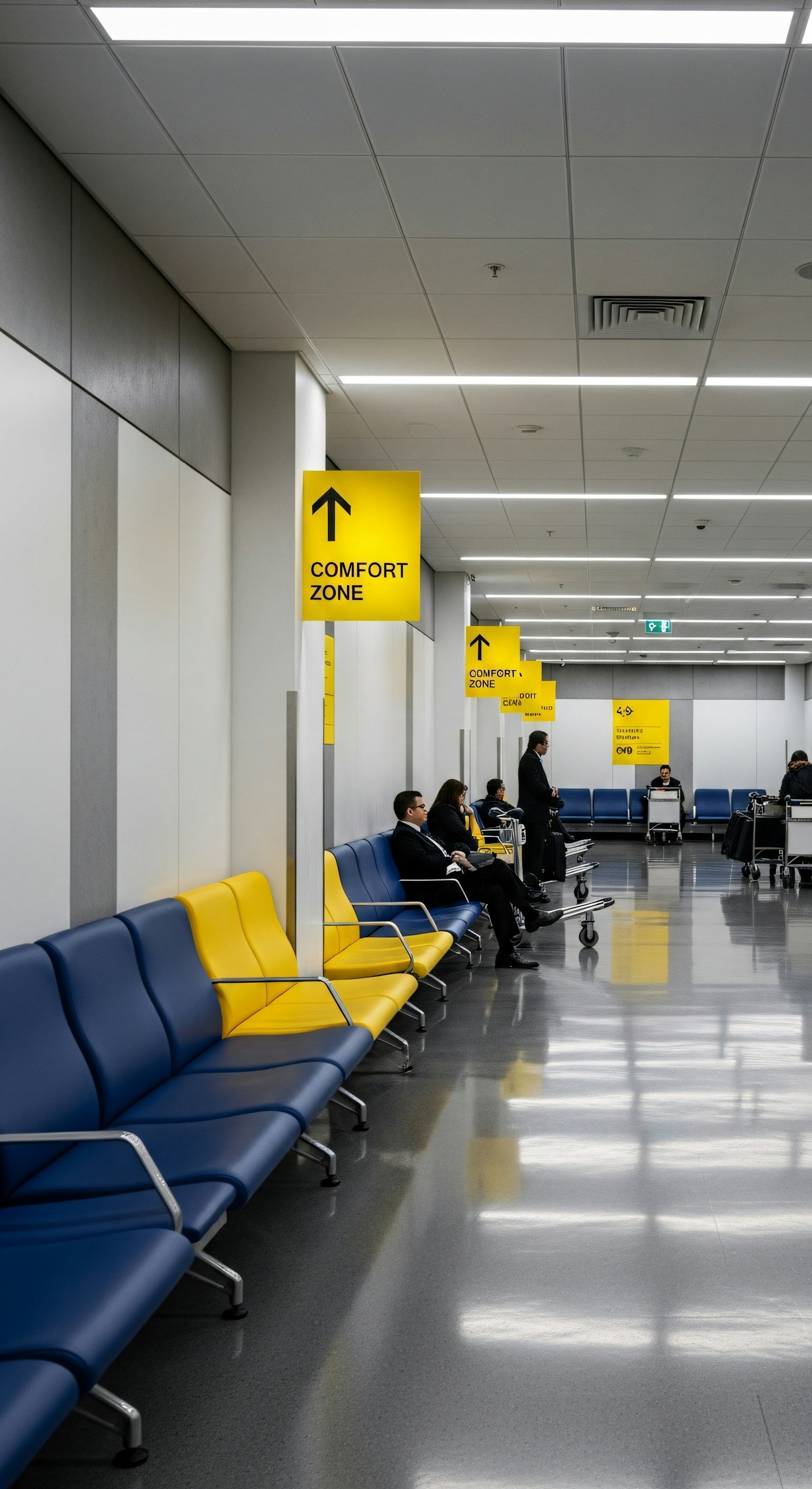 Bright airport waiting area with blue and yellow seating, polished floors, and 'Comfort Zone' signs guiding passengers.