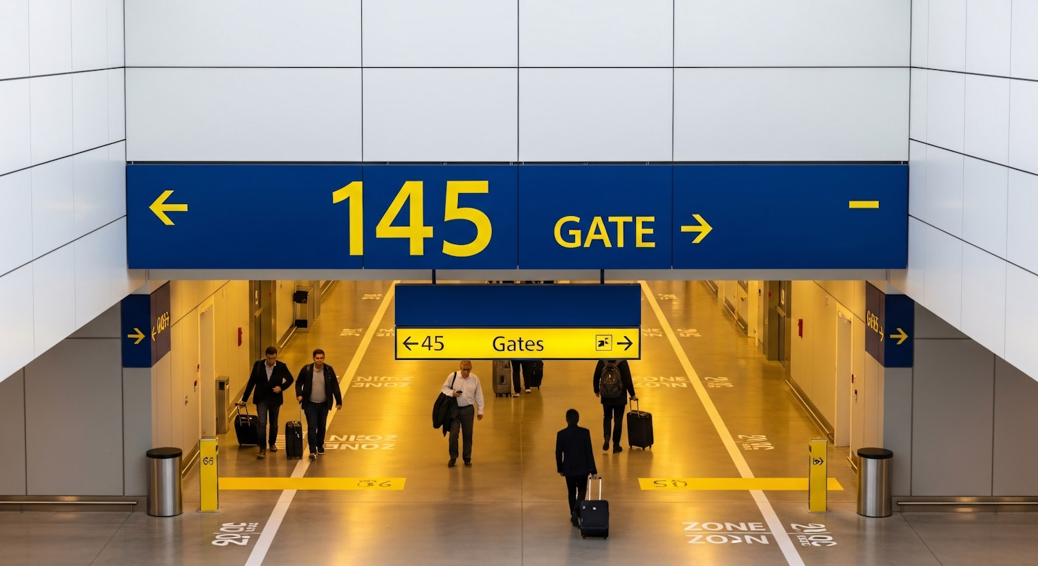 Bright airport terminal with travelers heading to Gate 145, featuring clear signage and a modern, clean design.