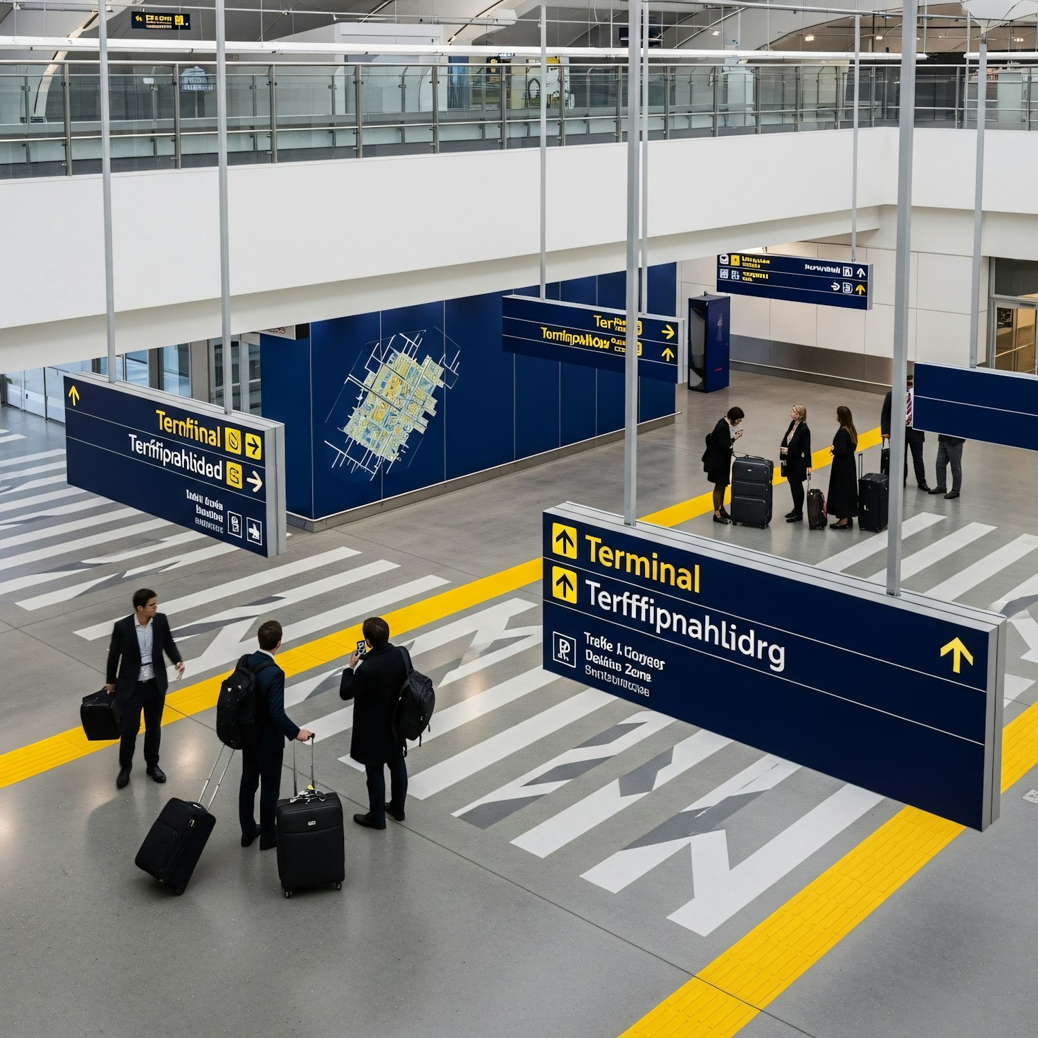 Modern airport terminal with travelers, luggage, and clear directional signage. Bright, spacious, and accessible design for convenience.