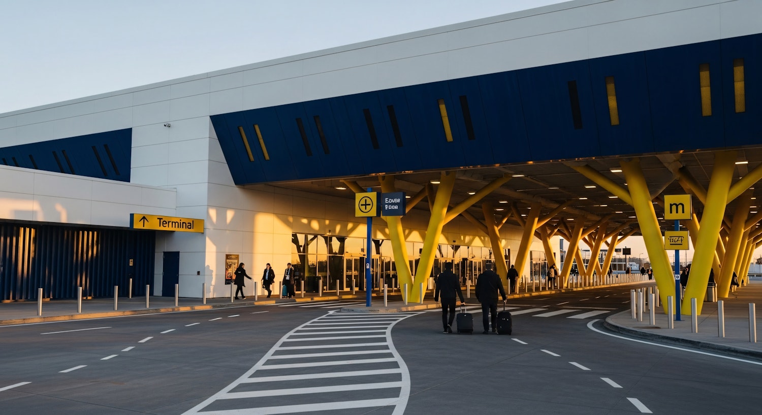 Modern airport terminal exterior with bold yellow columns, blue accents, and travelers with luggage under warm sunlight.