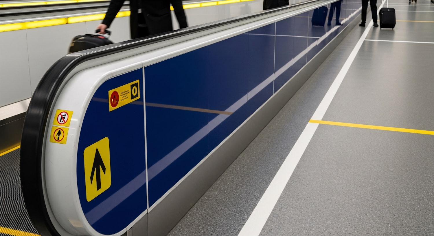 A sleek airport moving walkway with blue panels, safety signs, and travelers pulling suitcases, set in a clean, modern terminal.