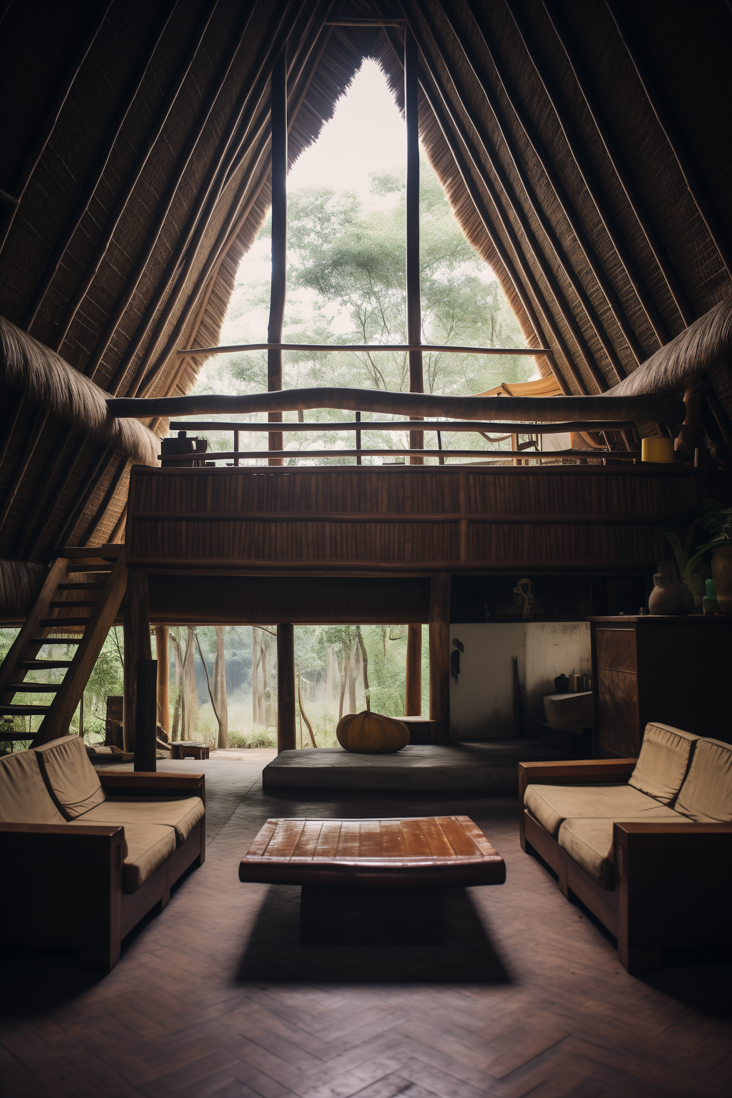 Rustic cabin interior with wooden furniture, thatched roof, and large windows offering a serene view of lush greenery.
