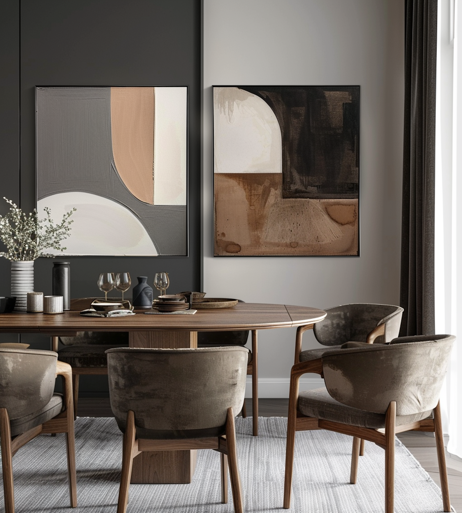 Modern dining room with abstract art, wooden table, velvet chairs, and elegant table setting. Neutral tones create a sophisticated ambiance.