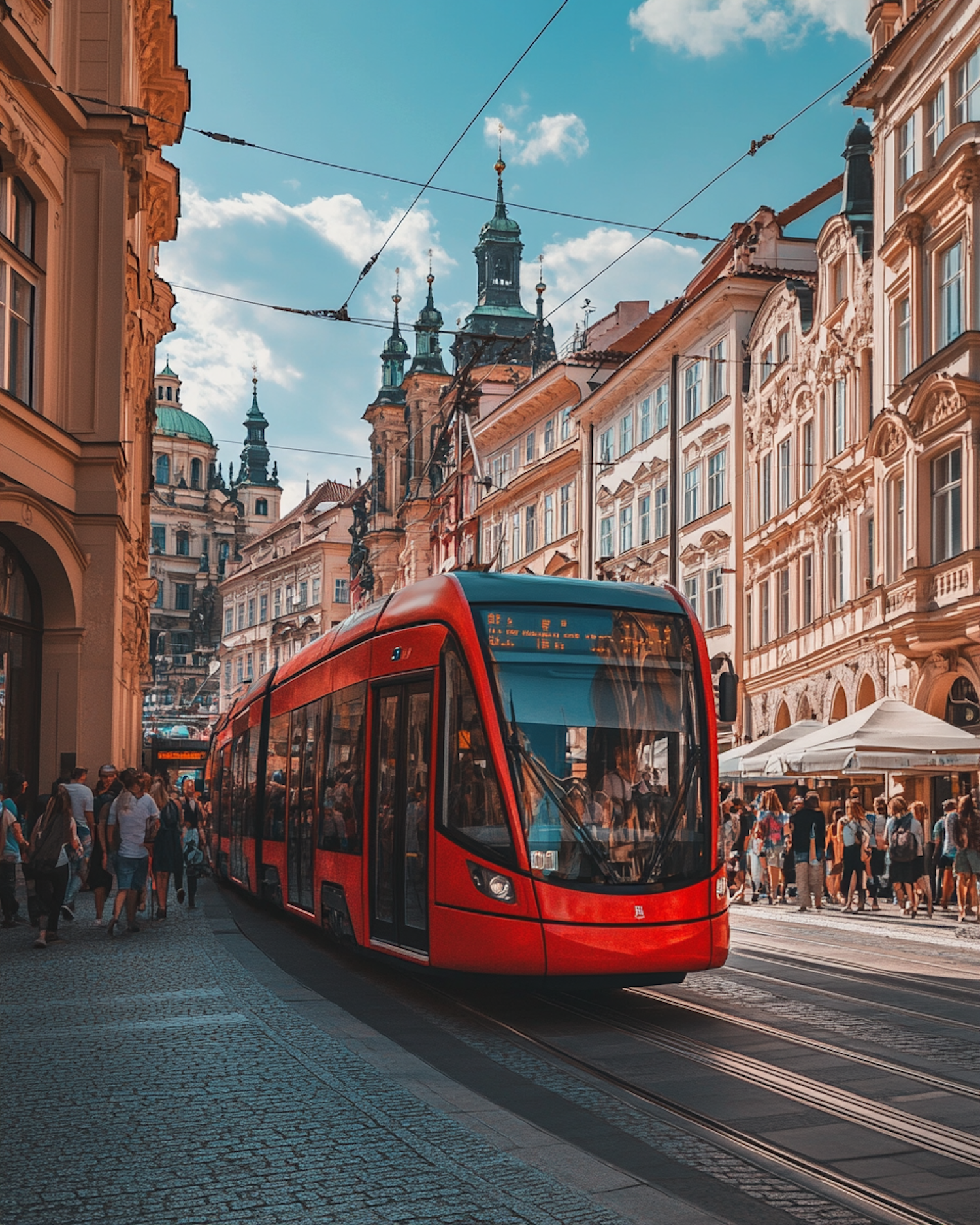 Red tram in a bustling European city street with historic architecture and lively pedestrian activity under a bright blue sky.