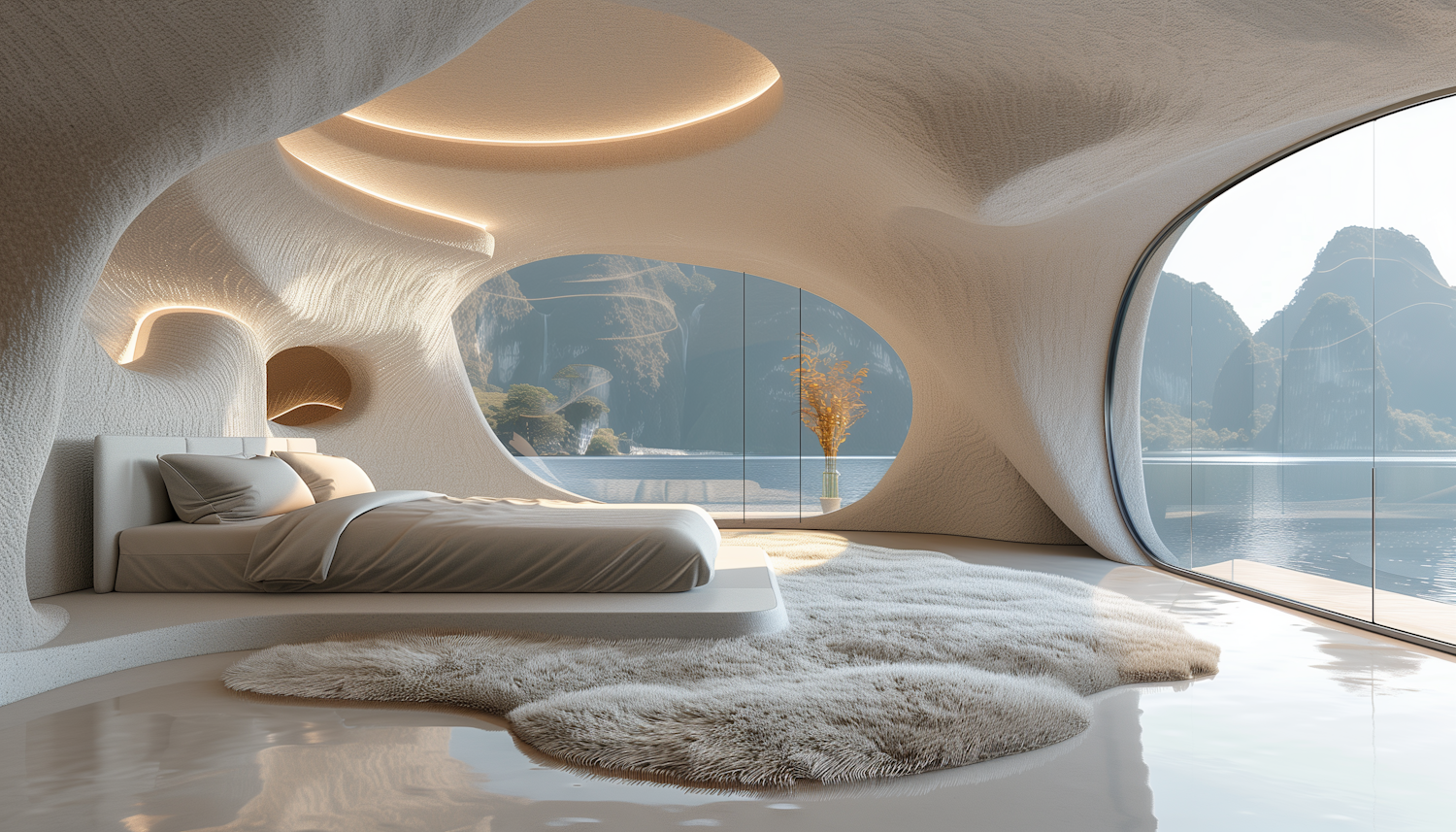 Futuristic bedroom with cave-like design, large window view of lake and mountains, minimalist bed, and plush rug for a serene ambiance.