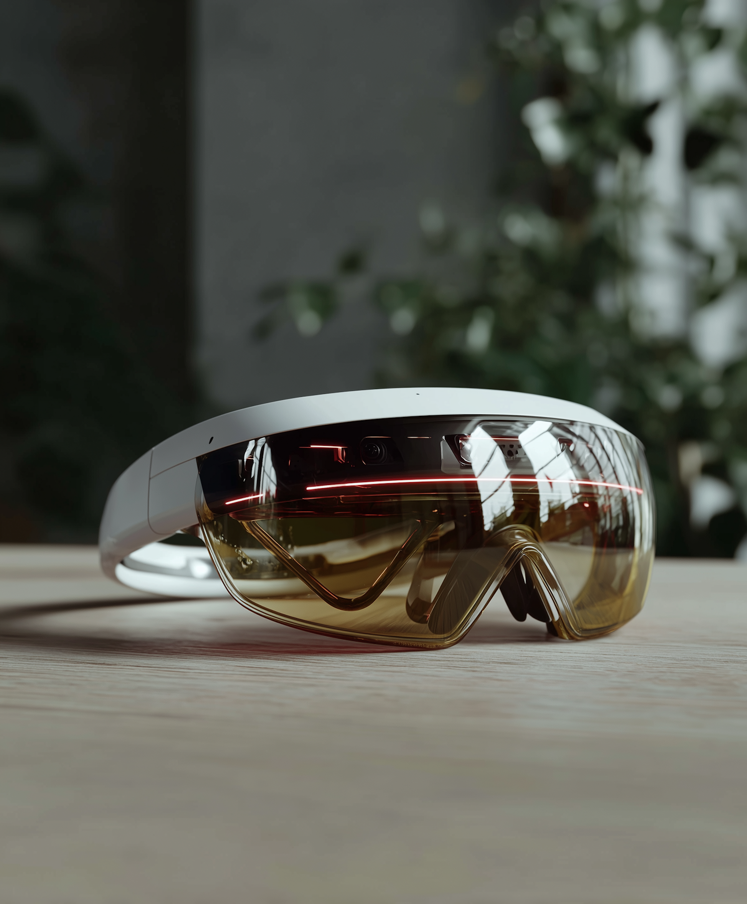 Stylish augmented reality headset with amber-tinted visor and advanced sensors, resting on a wooden surface with a blurred natural background.