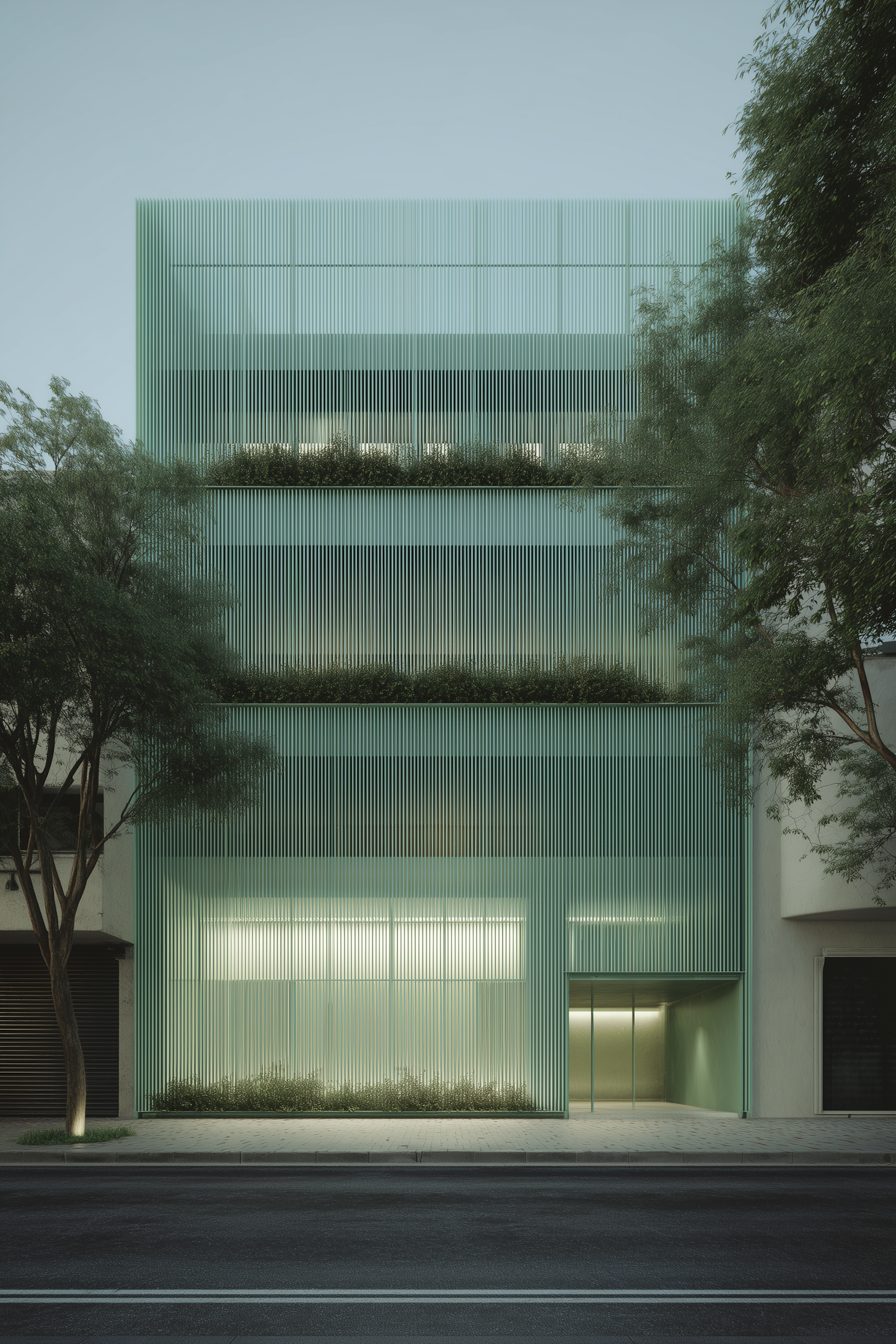 Modern building with vertical green slats, integrated greenery, and a sleek minimalist design, blending urban and natural elements.