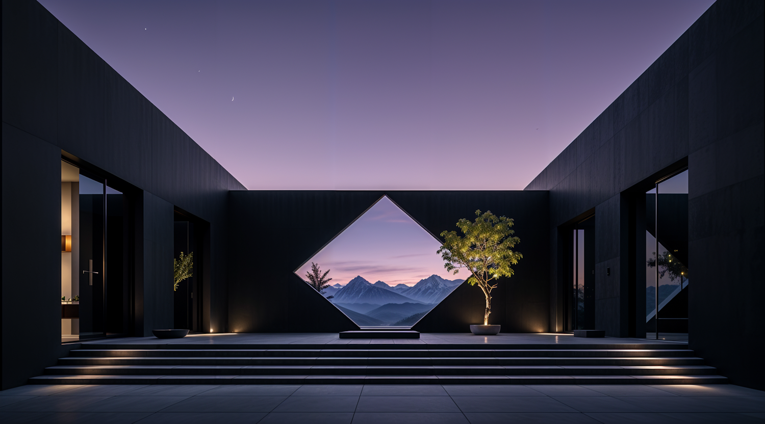 Modern minimalist courtyard with a diamond-shaped mountain view, twilight sky, and symmetrical potted trees.