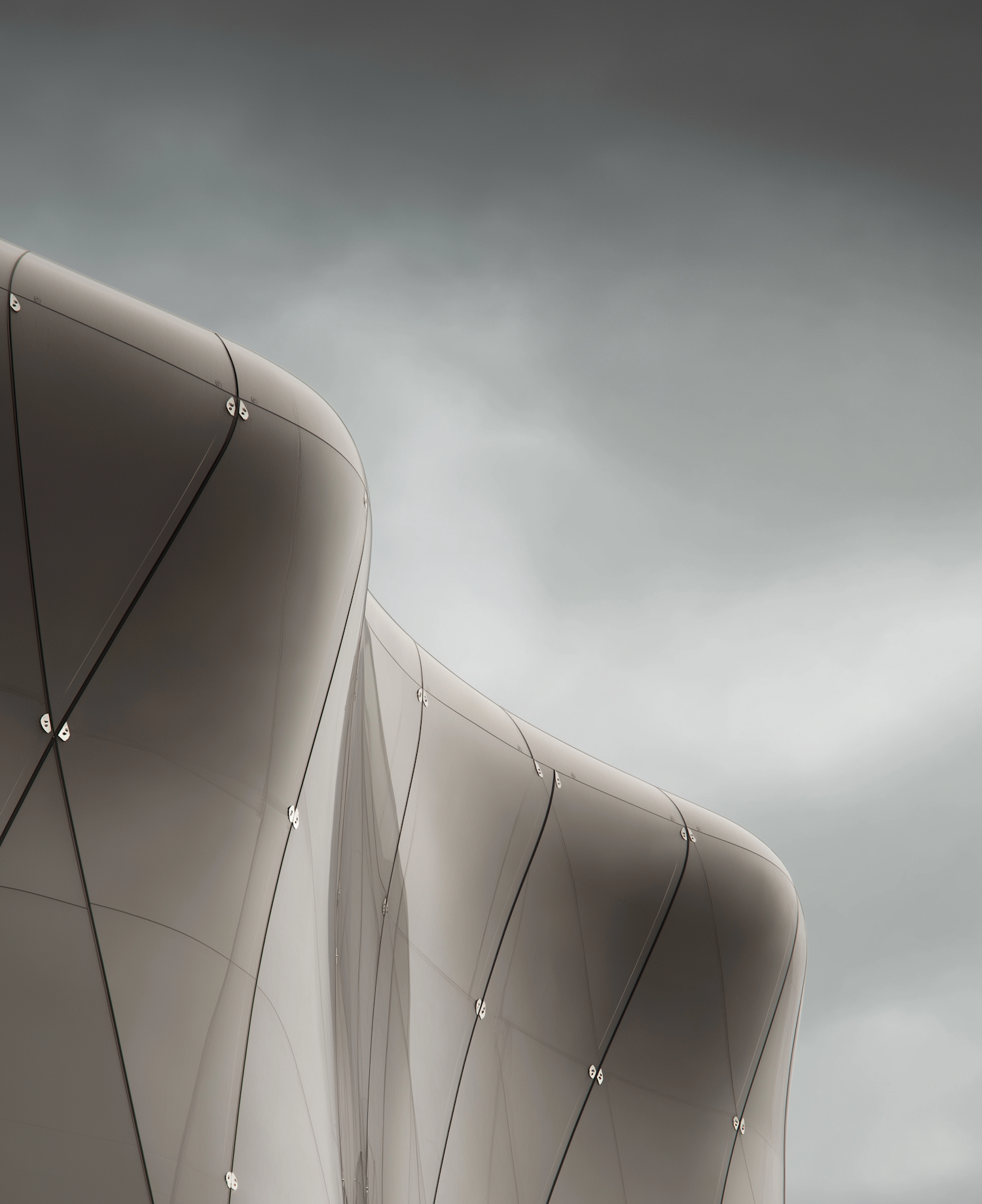 Sleek modern architecture with curved reflective panels against a dramatic cloudy sky, showcasing innovative design and elegance.