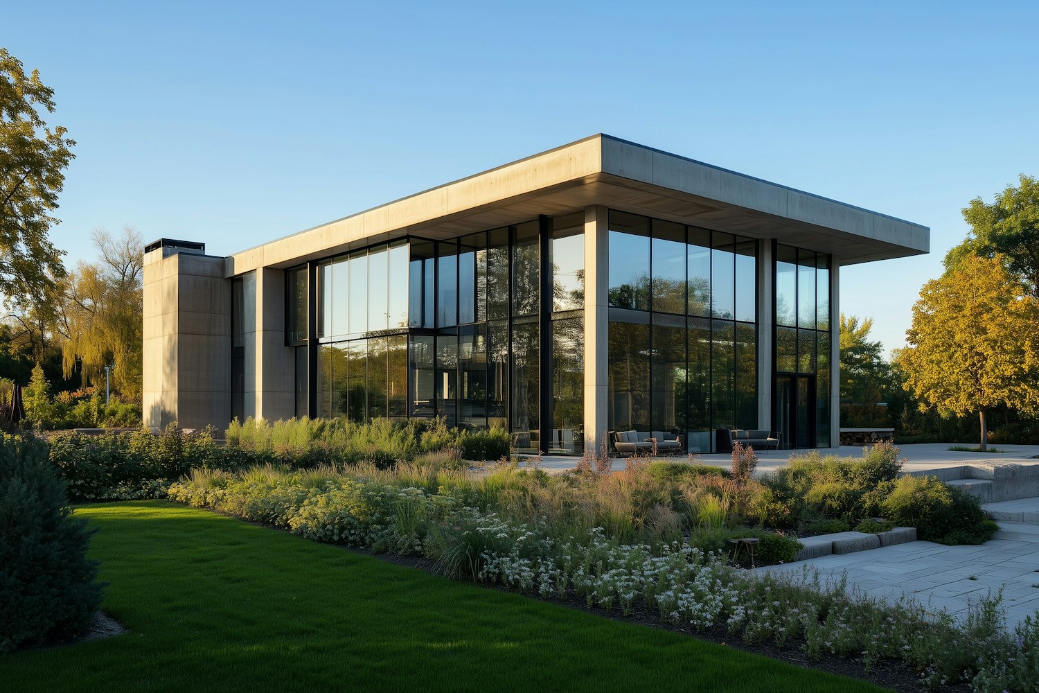 Modern glass building with concrete framing, surrounded by lush landscaping and bathed in golden hour sunlight.