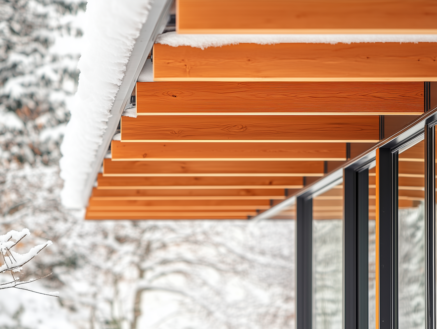 Modern architecture with wooden overhangs and snow, featuring large glass windows and a serene winter landscape.