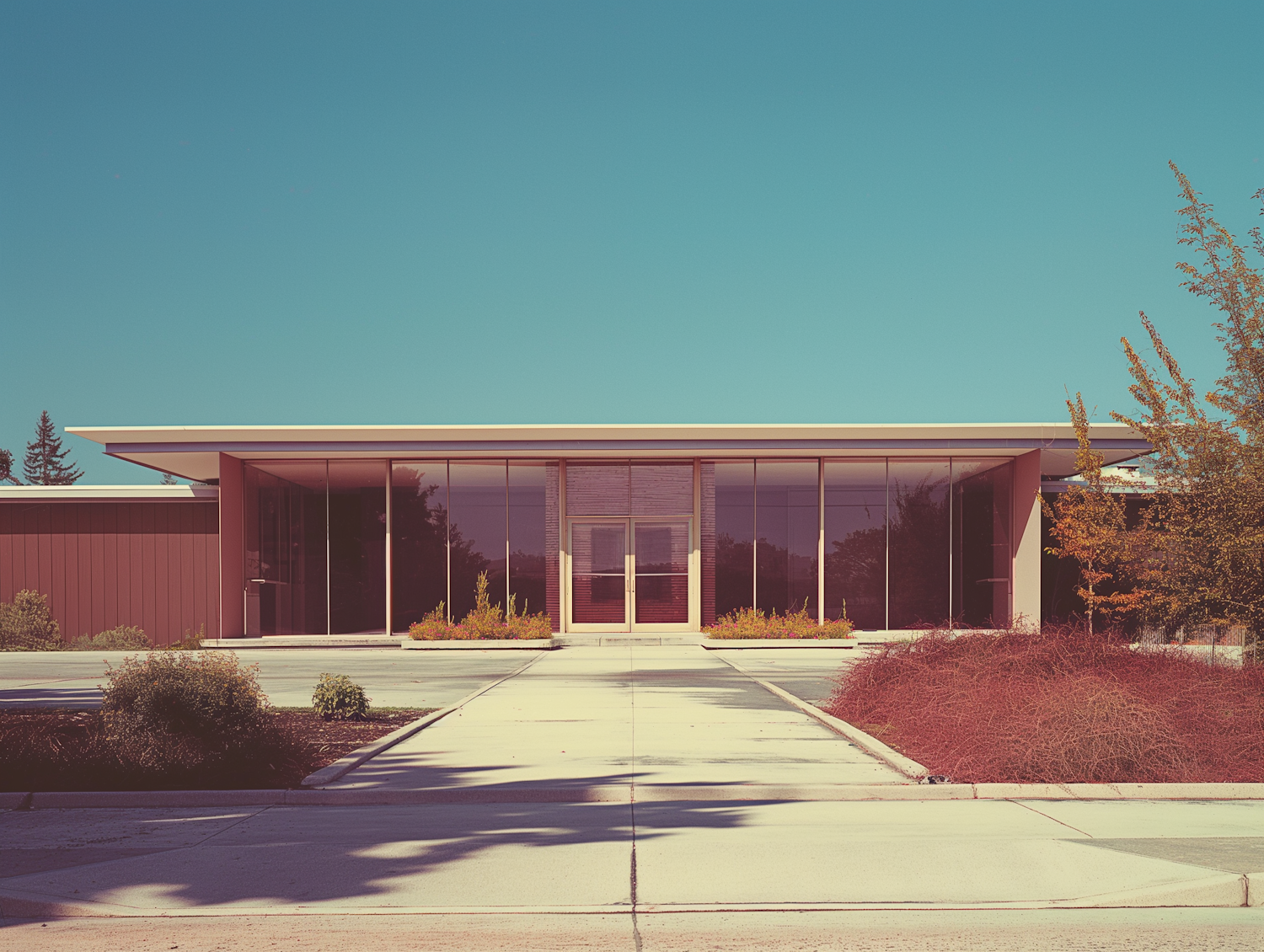 Mid-century modern building with glass panels, flat roof, and landscaped foreground under a vibrant blue sky.