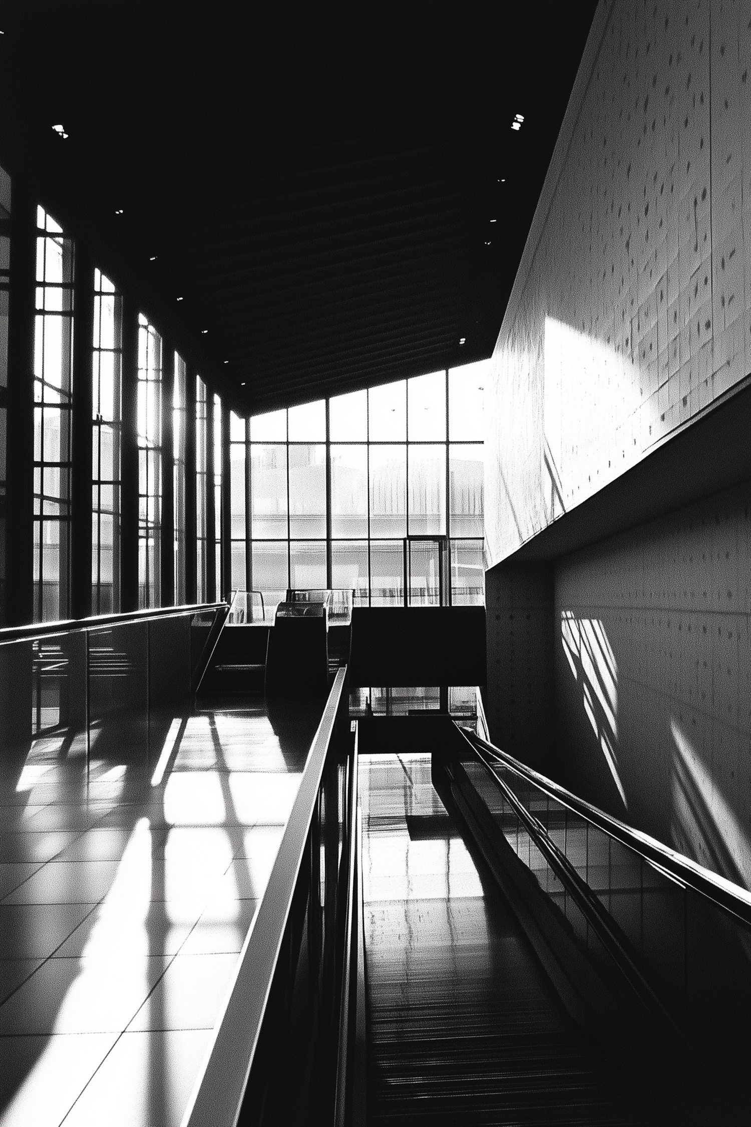 Monochrome interior with large windows, escalator, and striking light and shadow play in a modern architectural space.