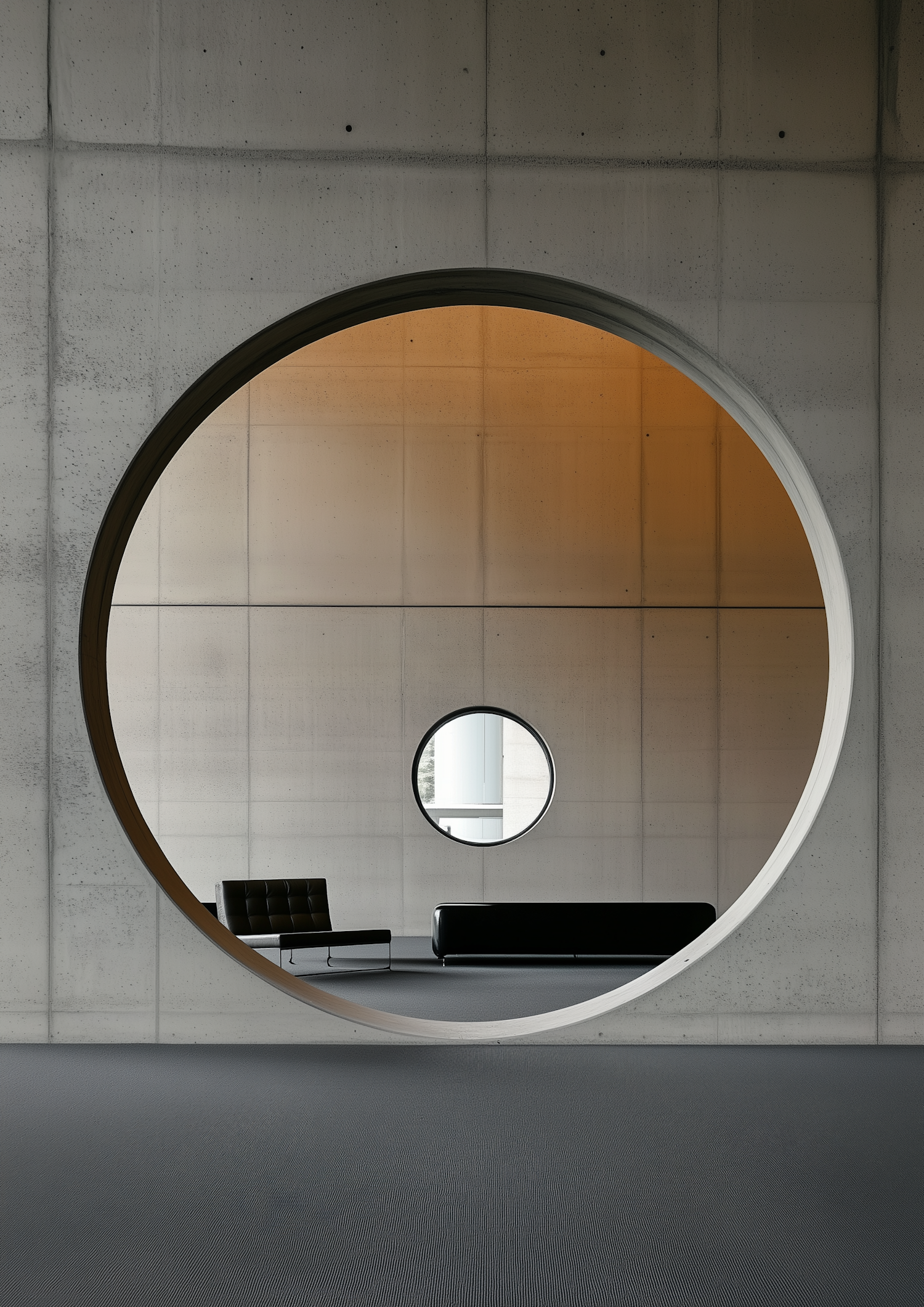 Modern interior with circular concrete wall opening, black leather furniture, and aligned windows creating a geometric visual effect.
