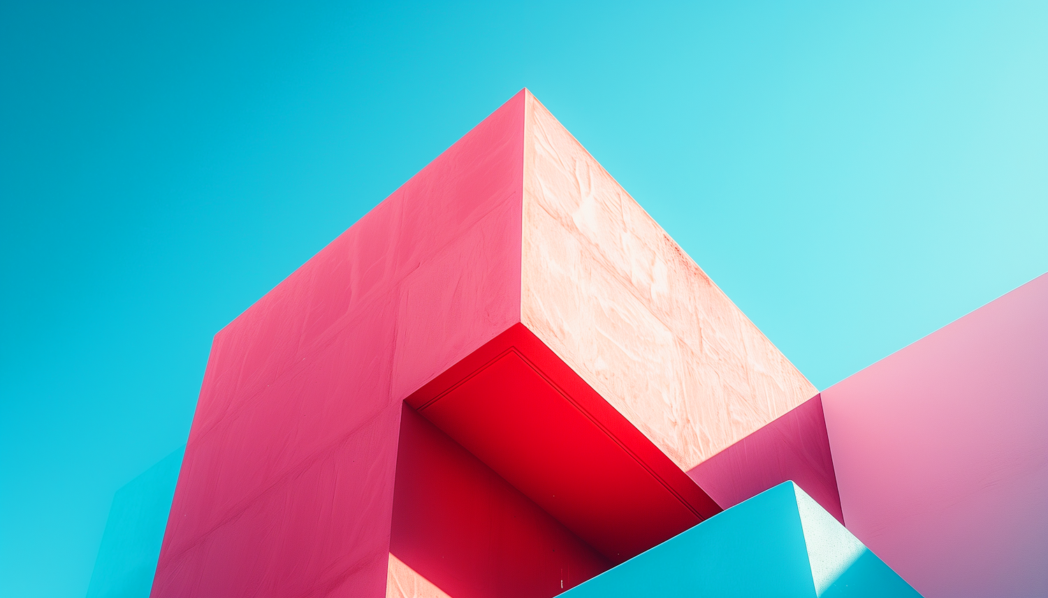 Vibrant geometric architecture with bold pink and cyan hues against a clear blue sky, creating a modern and abstract aesthetic.