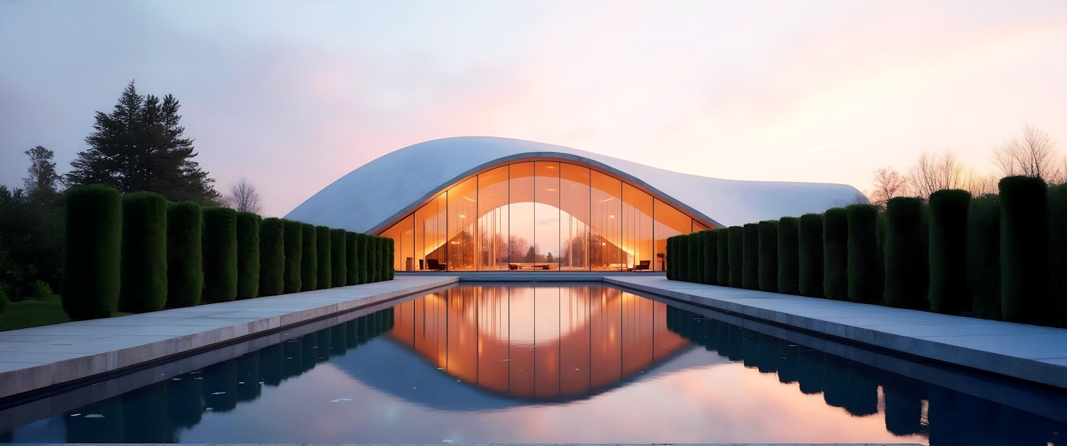 Modern curved-roof building with glass facade, reflecting pool, and trimmed hedges at sunset, blending architecture and nature.