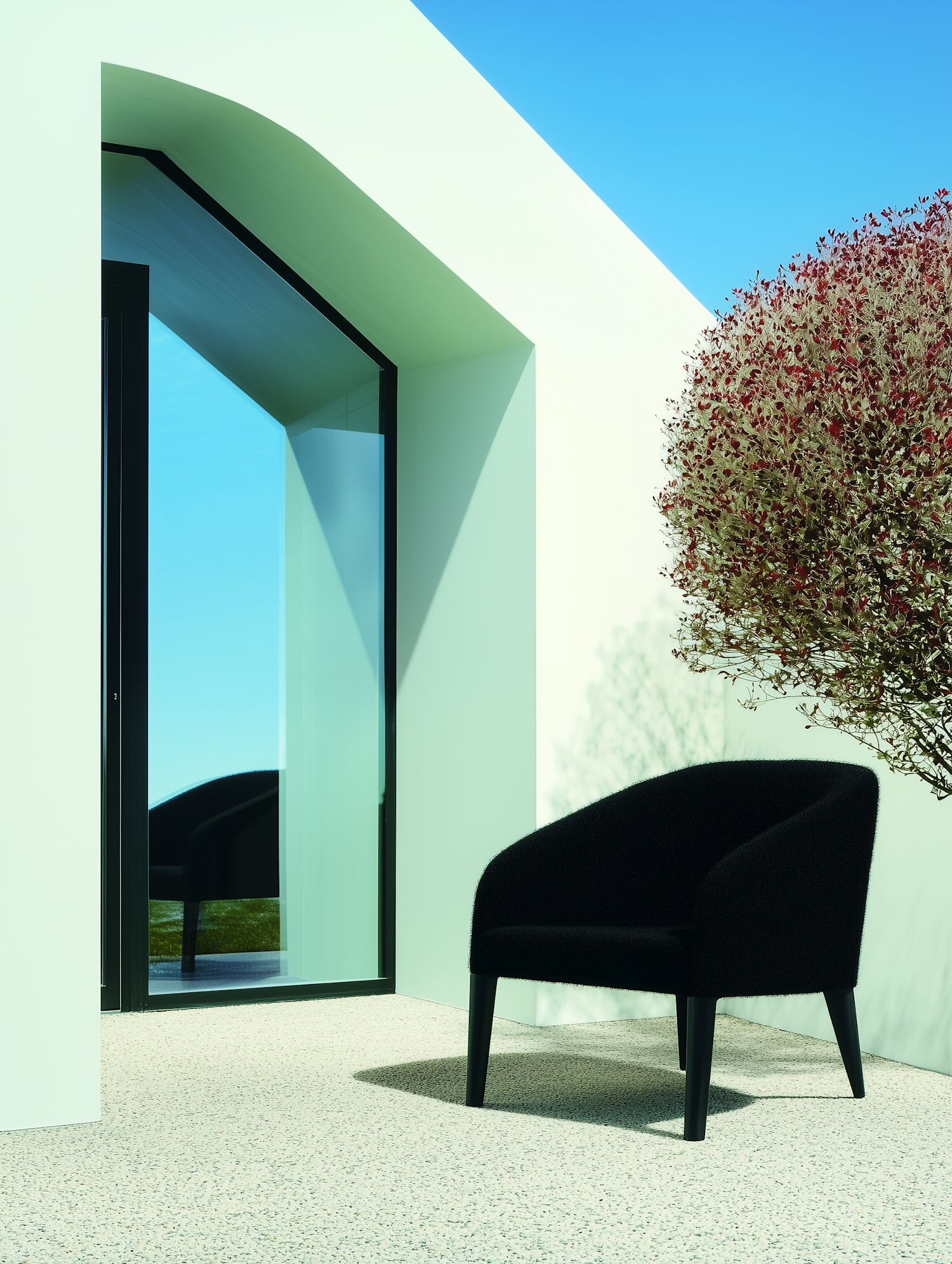 Modern outdoor scene with a black chair, glass door, and red-leaved bush against a light green facade and blue sky.