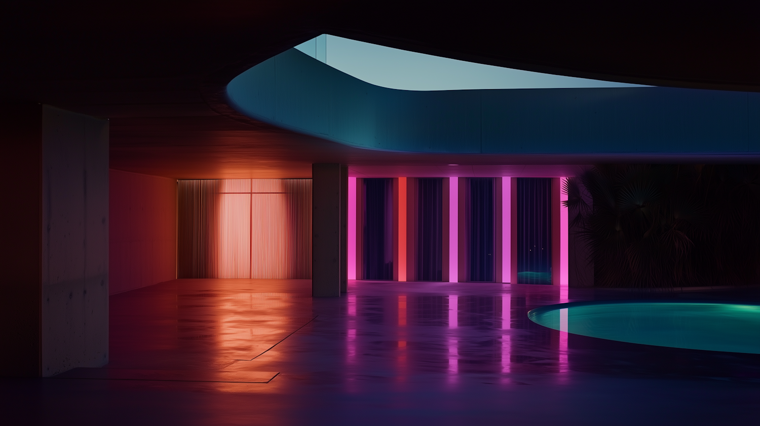 Modern space with vibrant lighting, featuring a circular pool and colorful light strips creating a futuristic ambiance.