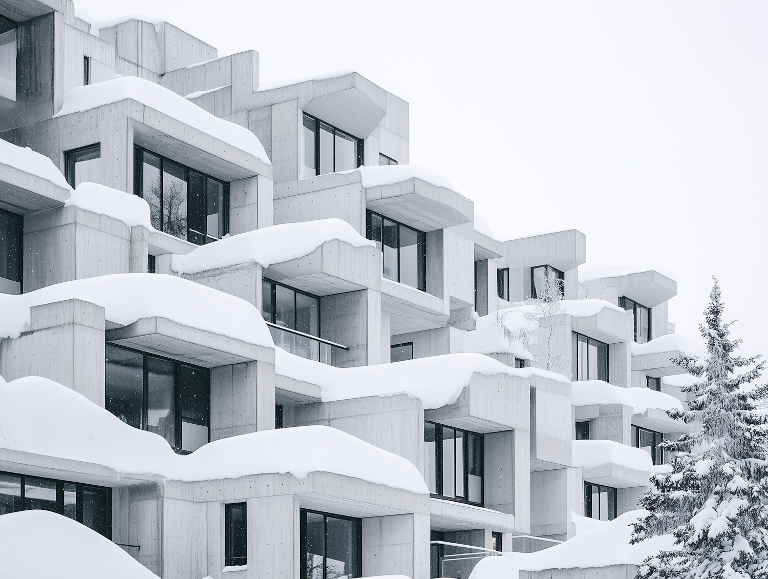 Modern concrete building with geometric design covered in snow, featuring large windows and a snow-laden evergreen tree in the foreground.