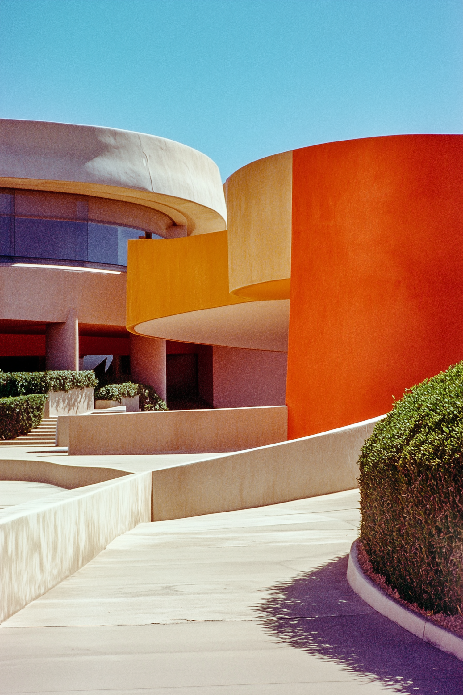 Modern architecture with bold colors and geometric shapes, featuring orange and beige curved walls under a clear blue sky.