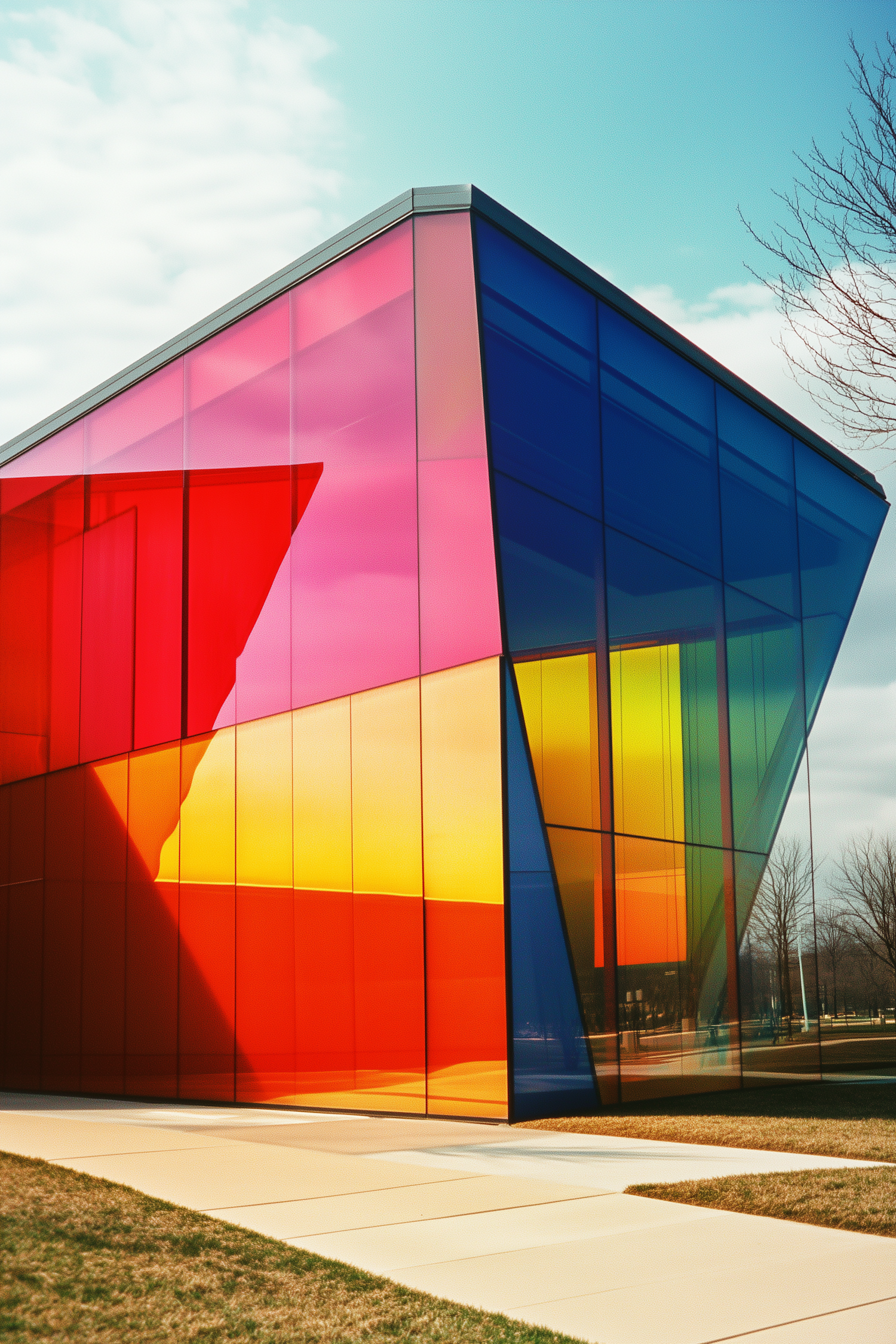 Modern building with vibrant red, orange, yellow, and blue glass panels, angular design, and dynamic reflections under a clear sky.