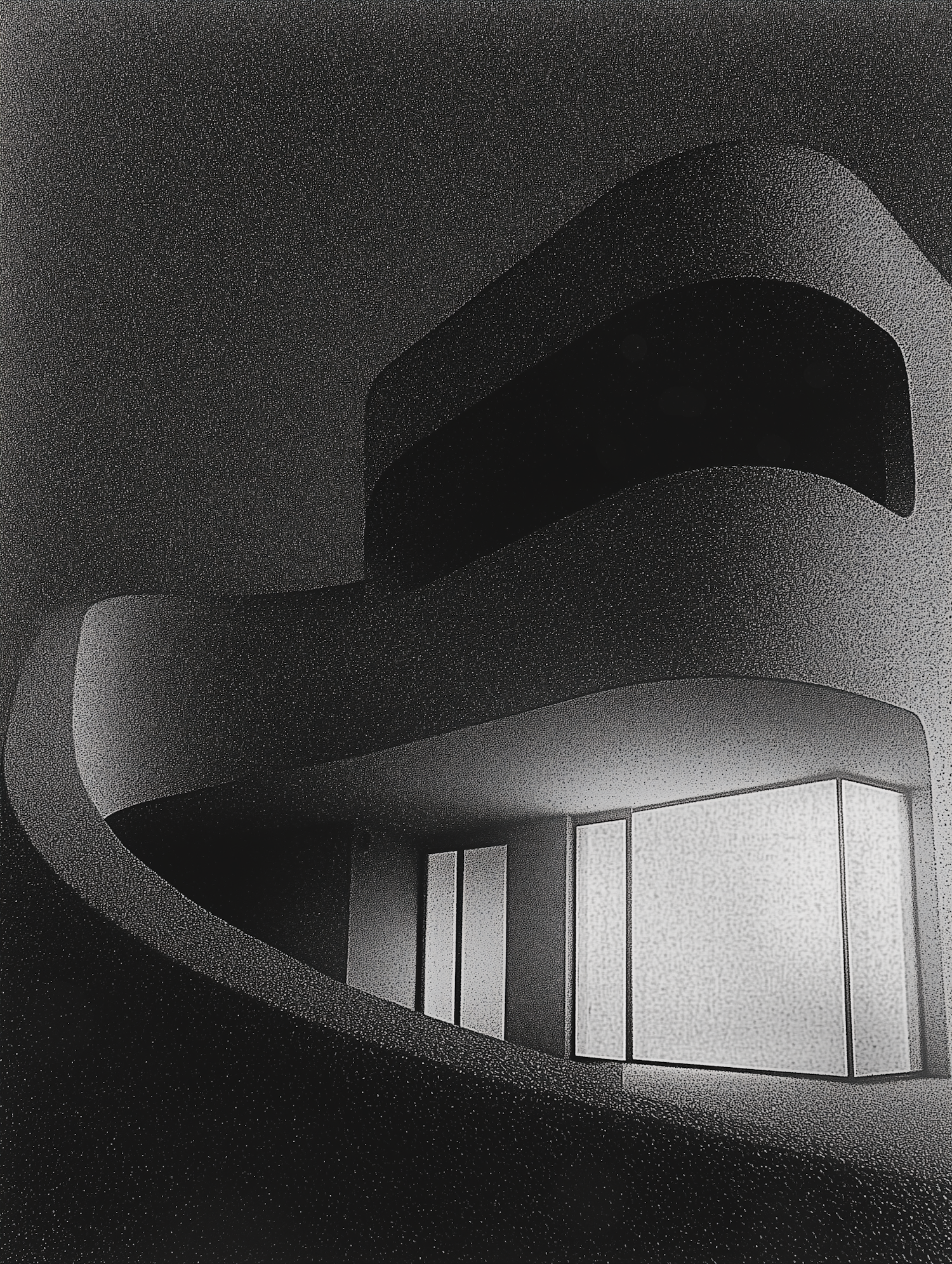 Futuristic building with smooth curves and dramatic lighting, featuring a bright window contrasting against a dark, textured facade.