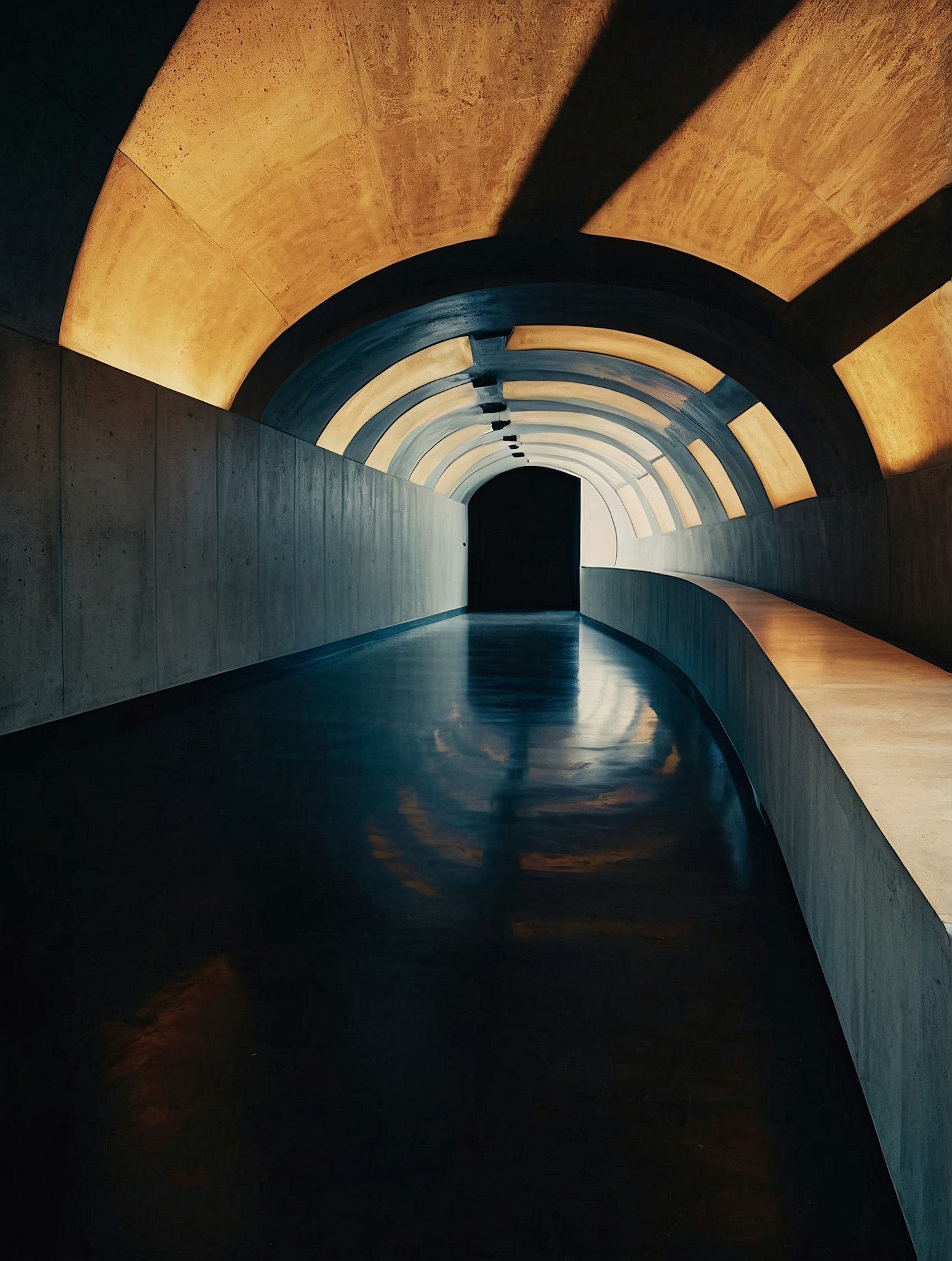 Curved concrete tunnel with ambient lighting and reflective floor, creating a dramatic play of light and shadow.