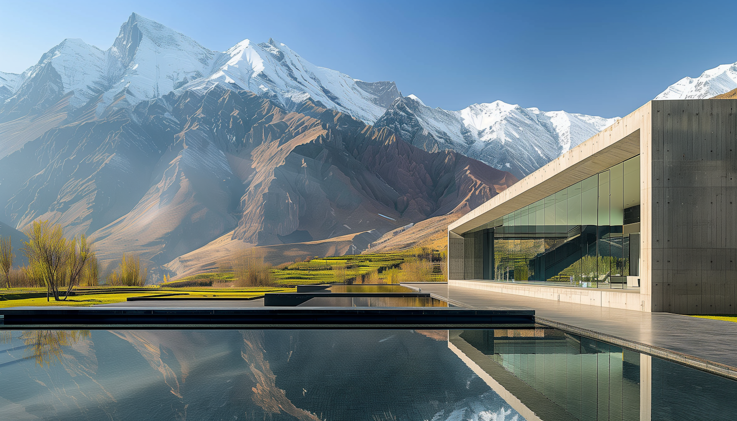 Modern architecture meets nature with a sleek building, reflecting pool, and snow-capped mountains under a clear blue sky.