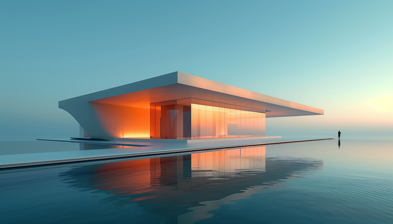 Modern minimalist building with glass walls reflecting on water, glowing with warm orange light. A lone figure stands by the serene scene.