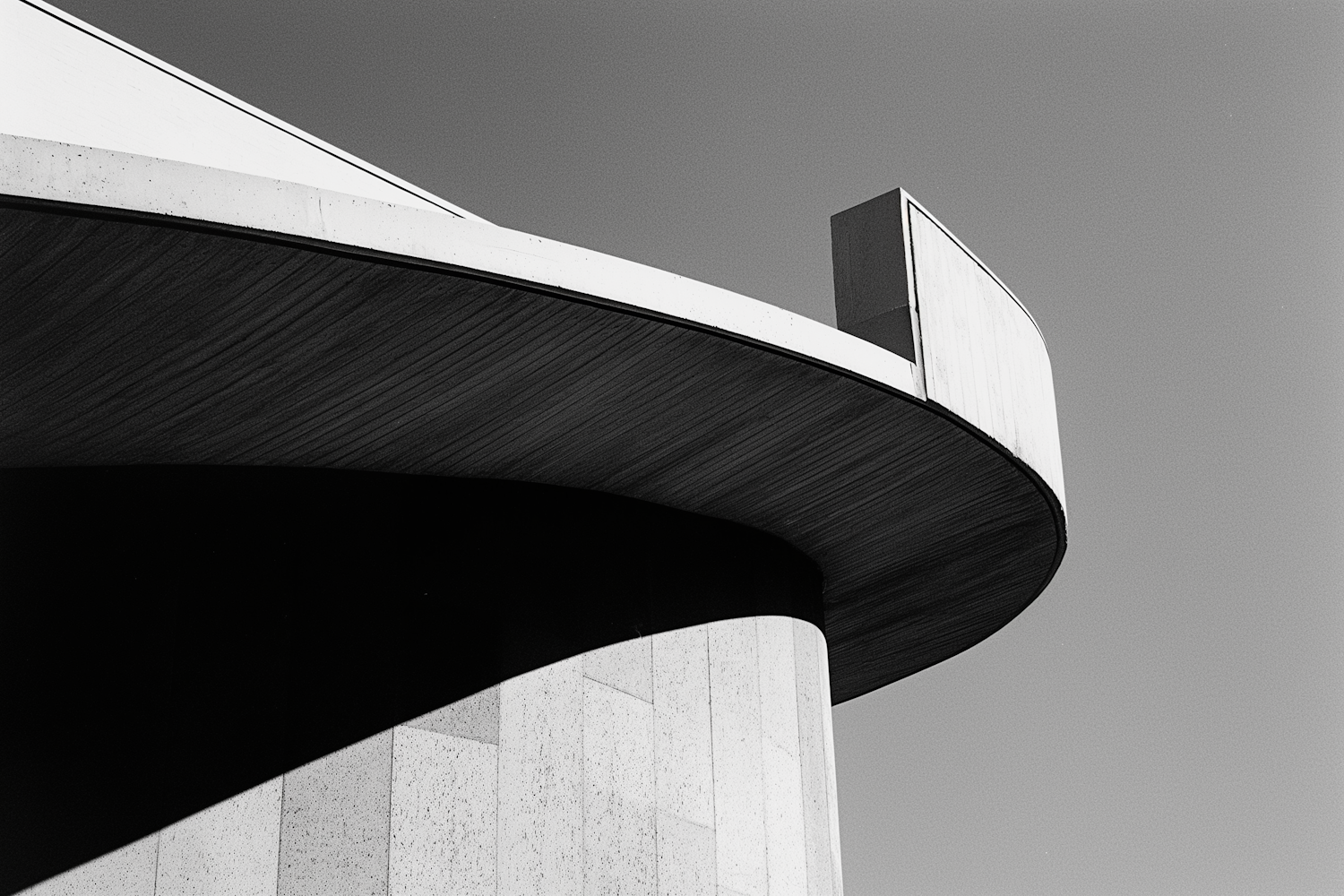 Black and white photo of a modern building with curved architecture, emphasizing light and shadow play.