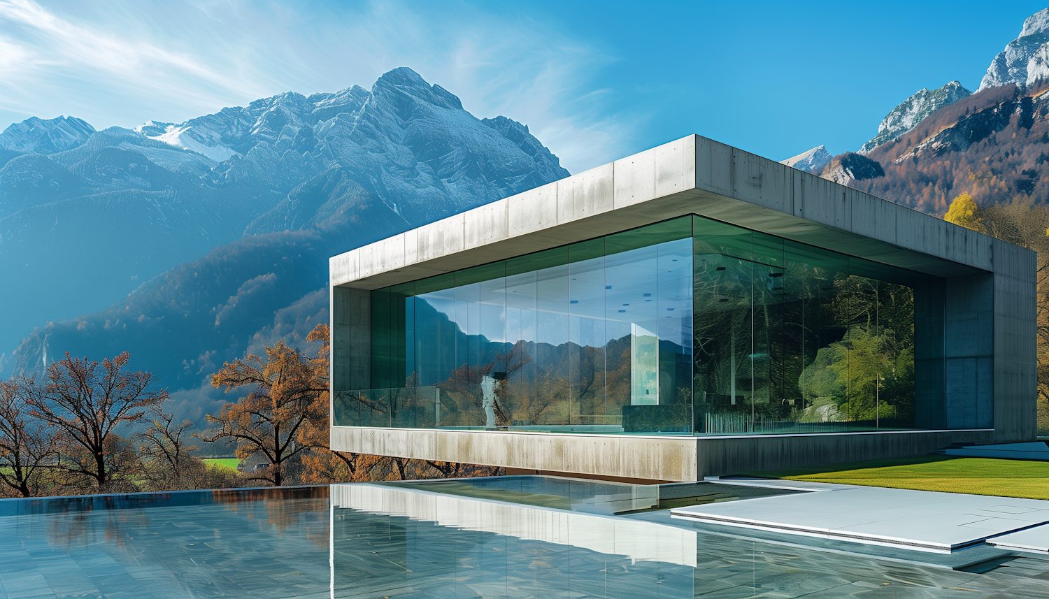 Modern glass building with mountain backdrop, reflecting in water. Sleek architecture meets stunning natural scenery.