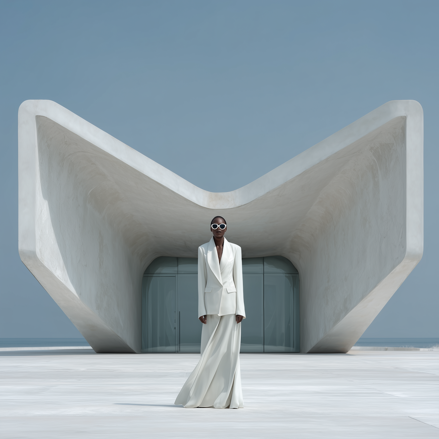 A stylish individual in white stands before a futuristic, angular building under a clear blue sky, blending fashion and modern architecture.