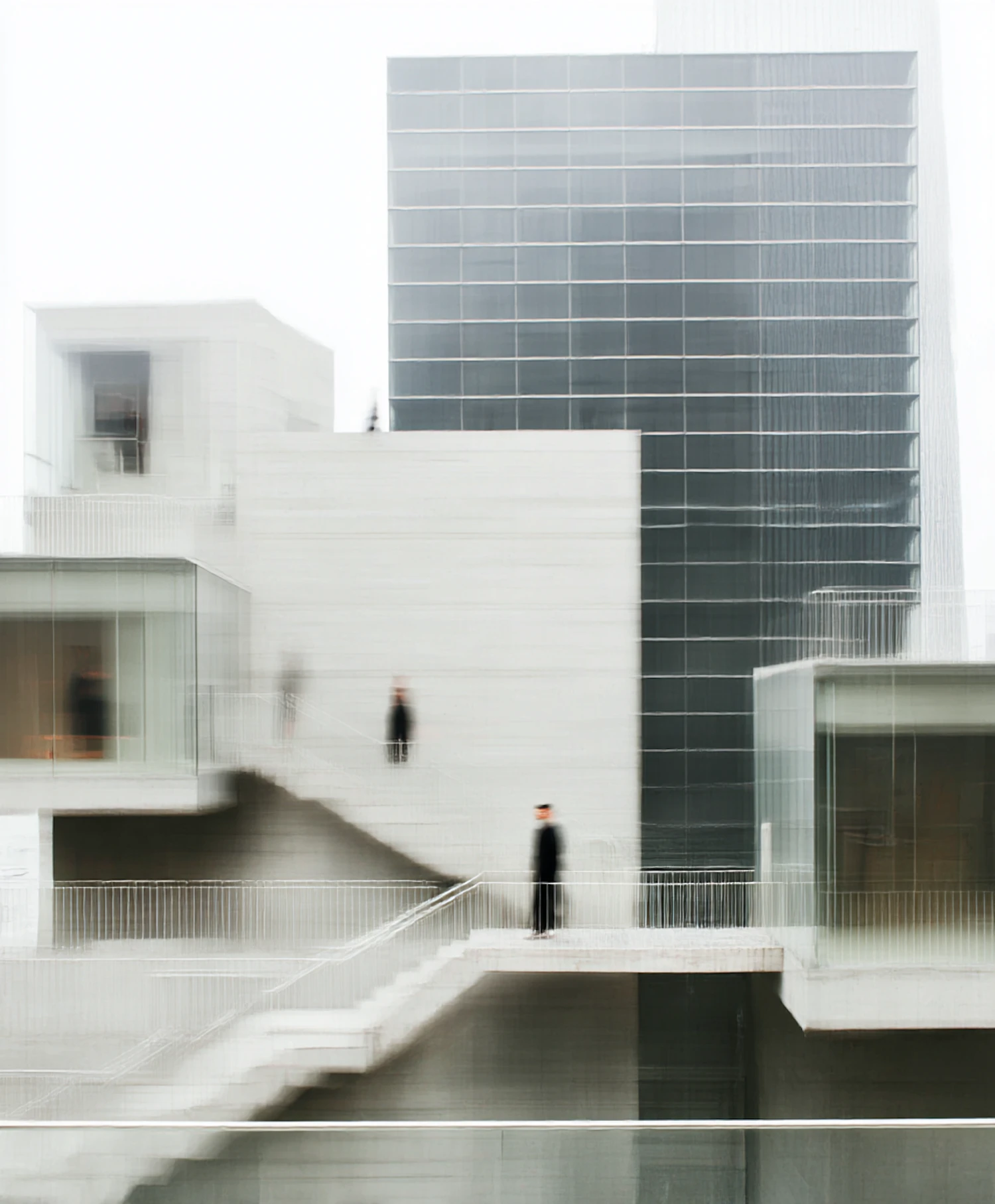 Modern architecture with clean lines, white concrete, and glass, featuring blurred figures on staircases against a dark grid-patterned facade.