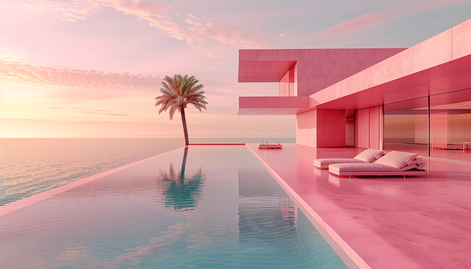 Luxurious pink-hued modern villa with infinity pool, ocean view, and palm tree. Elegant design and serene sunset ambiance.