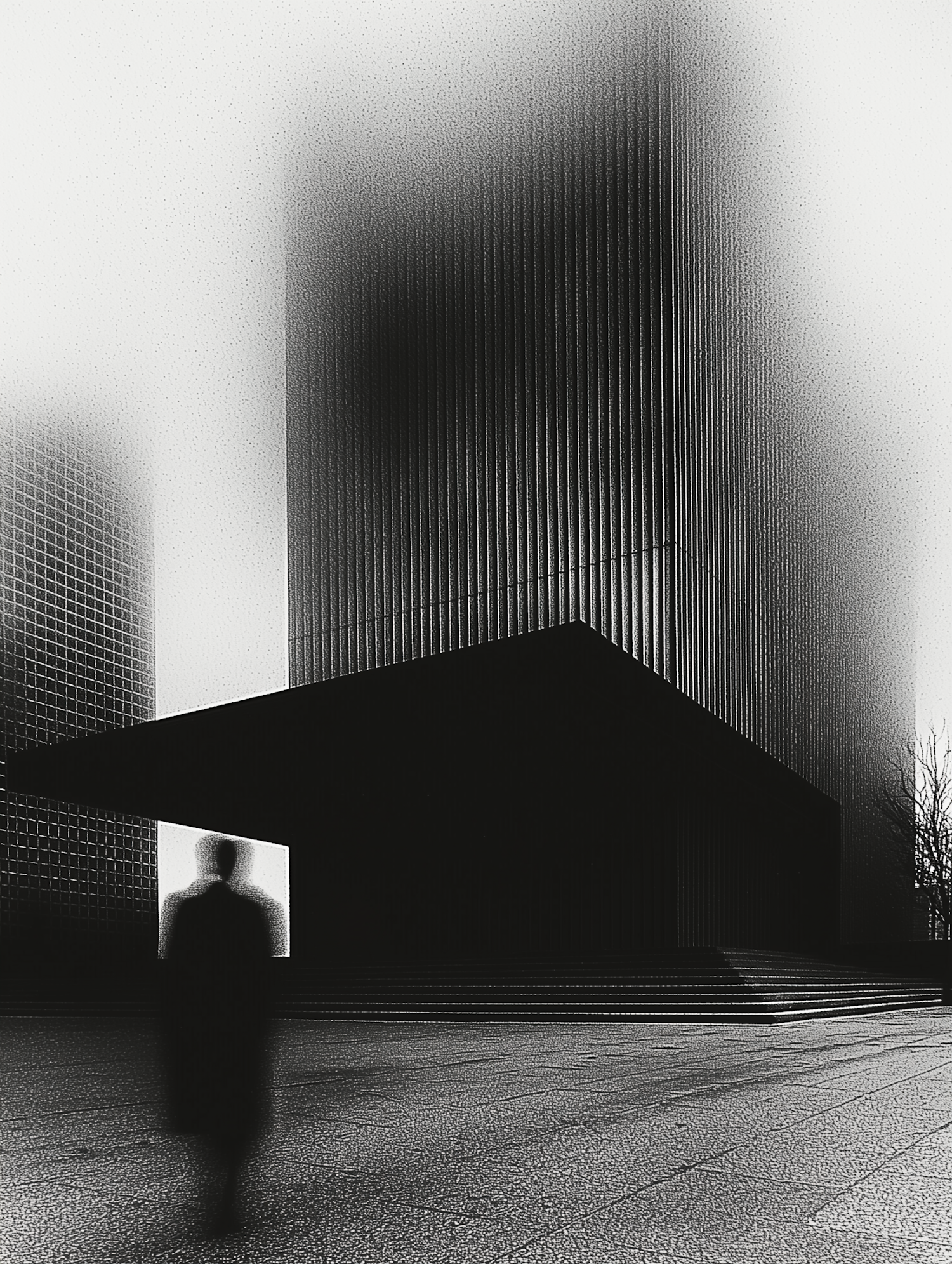 Surreal monochrome scene with a blurred figure approaching a towering building, creating a mysterious and abstract atmosphere.