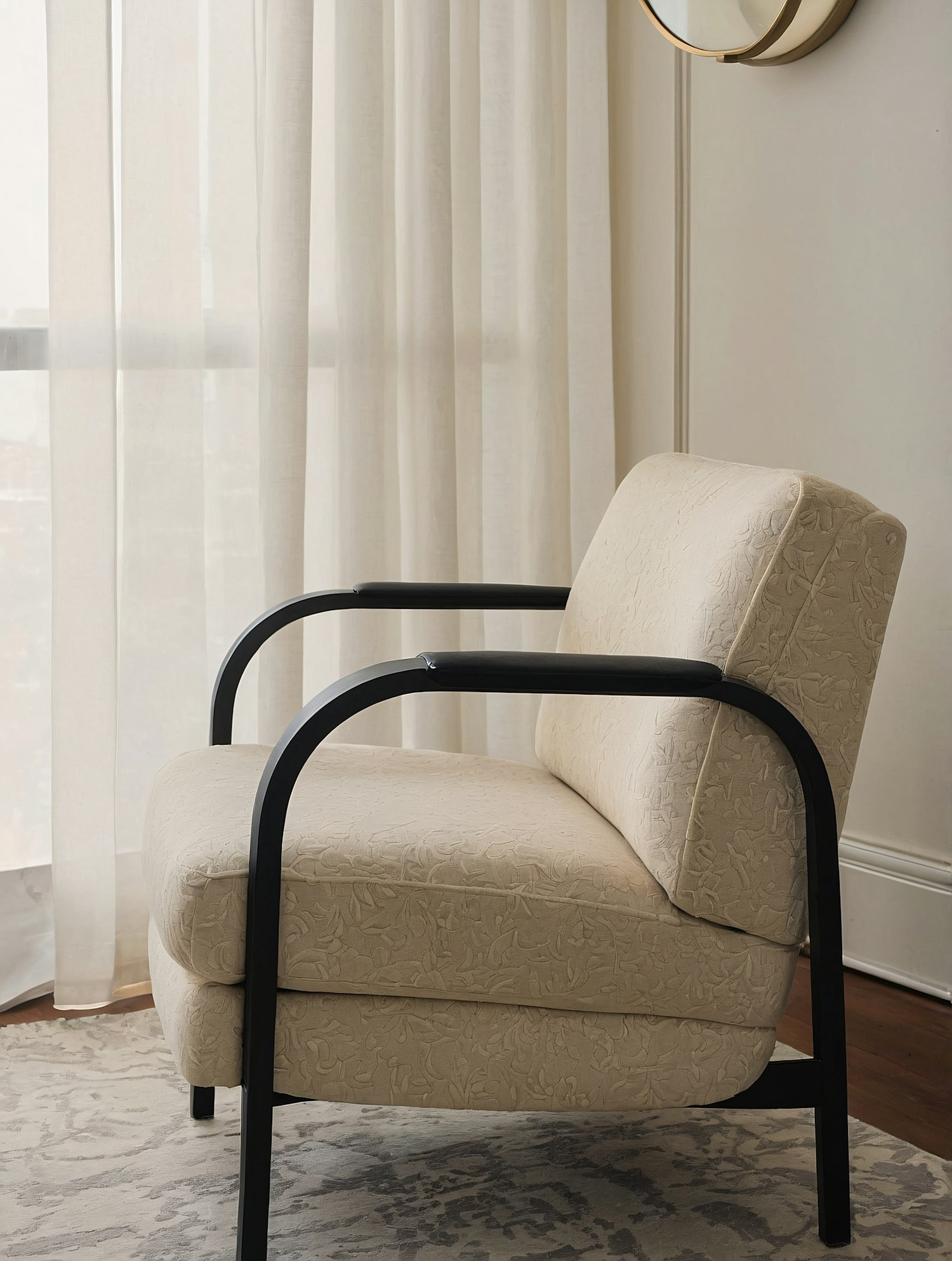 Modern beige armchair with floral upholstery and black metal frame in a cozy room with sheer curtains and a gold-framed mirror.