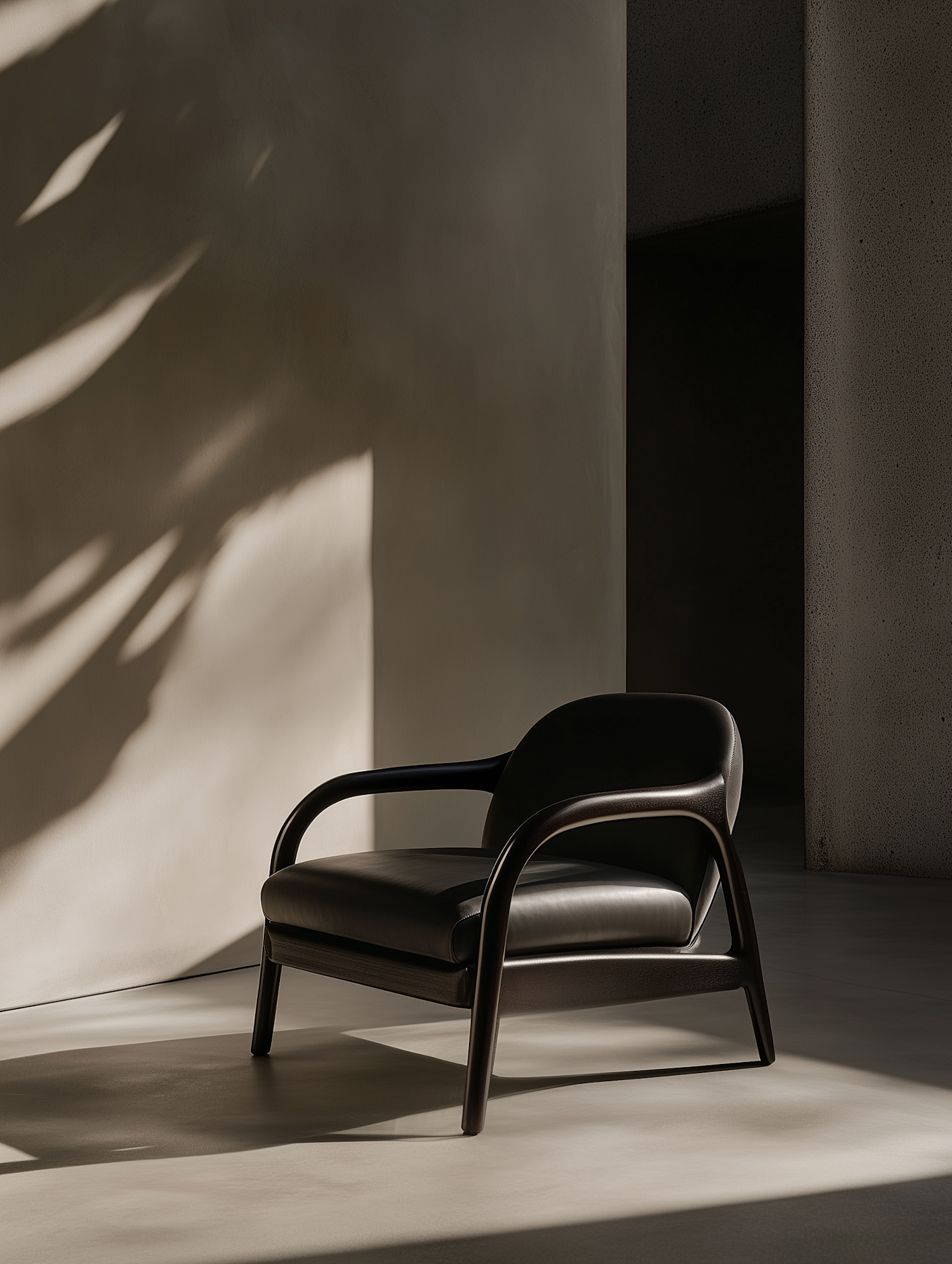 Minimalist black leather armchair with a curved wooden frame in a softly lit modern interior, showcasing elegant shadows and clean design.