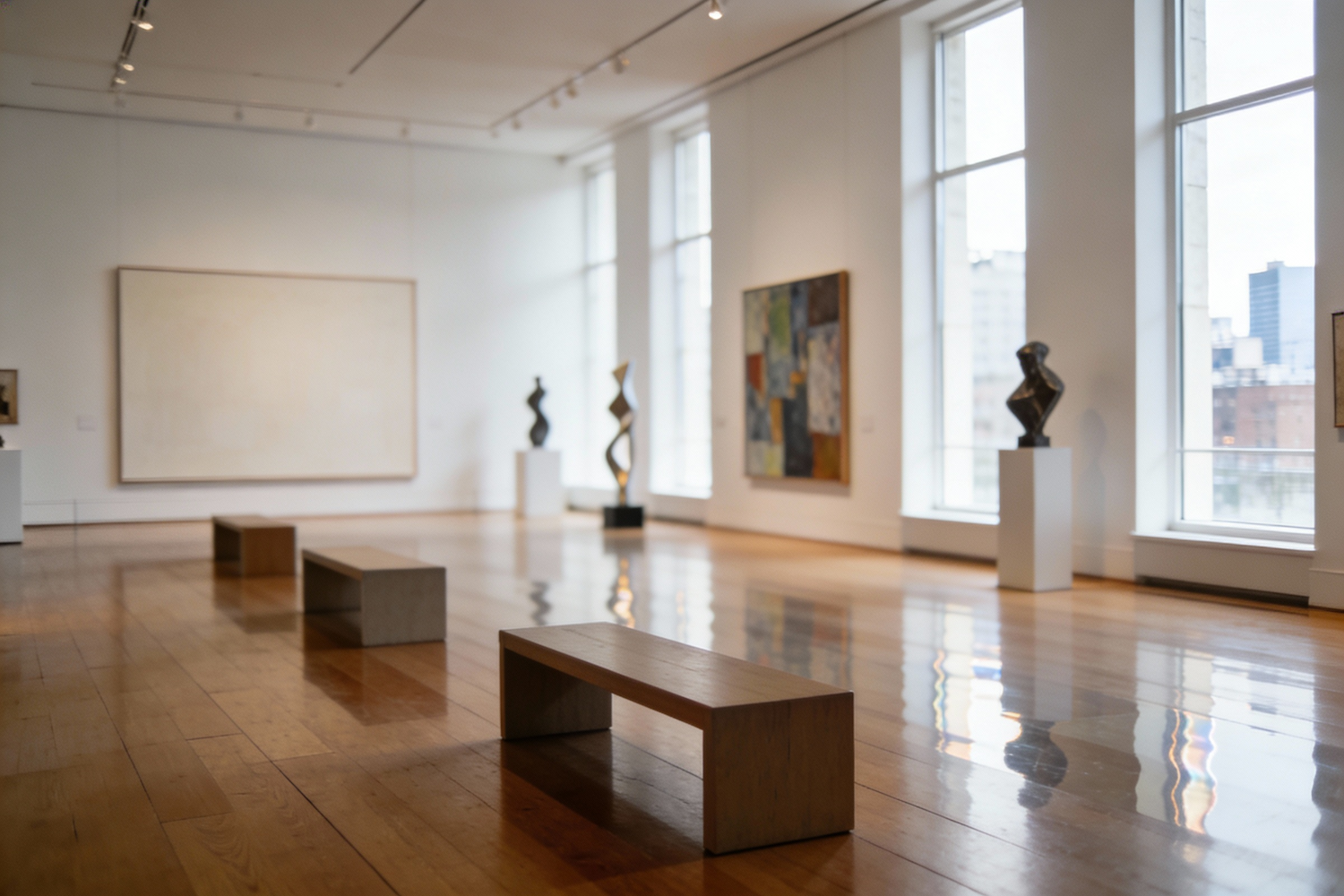 A serene art gallery with sculptures, abstract paintings, and minimalist benches, illuminated by natural light through large windows.