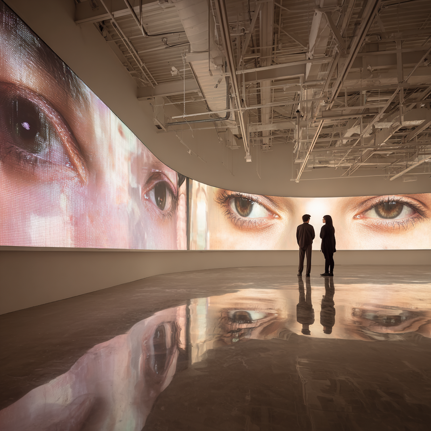 A modern gallery with a large digital screen displaying human eyes, observed by two individuals, with reflections on a polished floor.