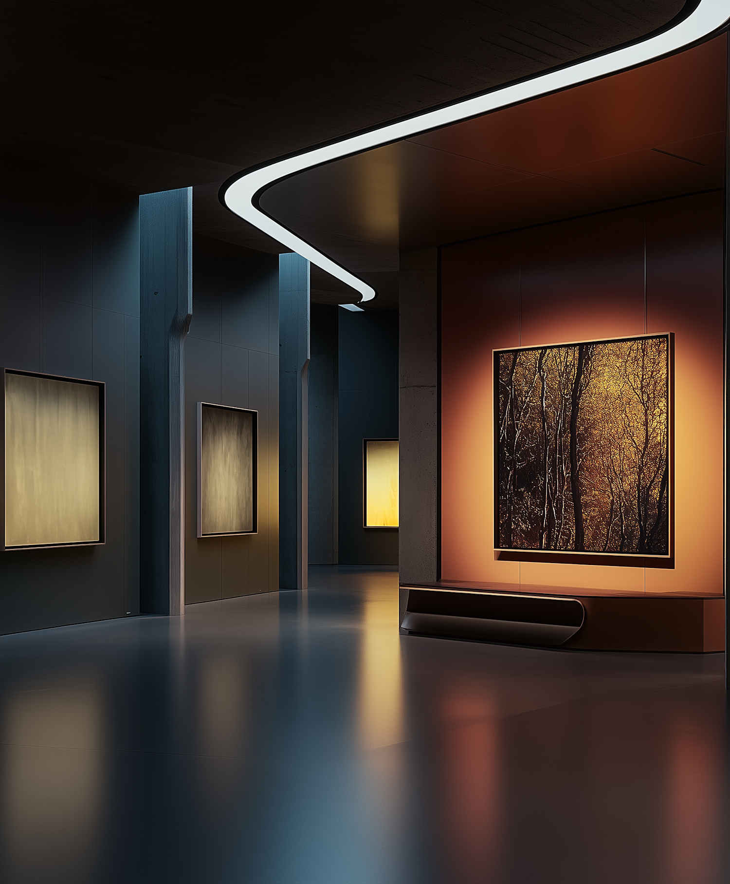 Modern art gallery with sleek design, abstract paintings, and ambient lighting. Curved ceiling light adds a contemporary touch.