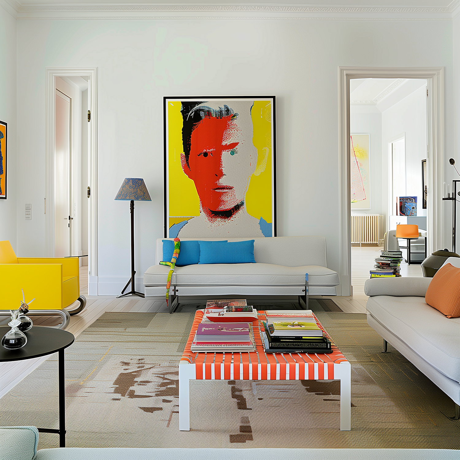 Bright living room with pop art decor, colorful furniture, and a bold portrait centerpiece. Modern, vibrant, and artistic design.